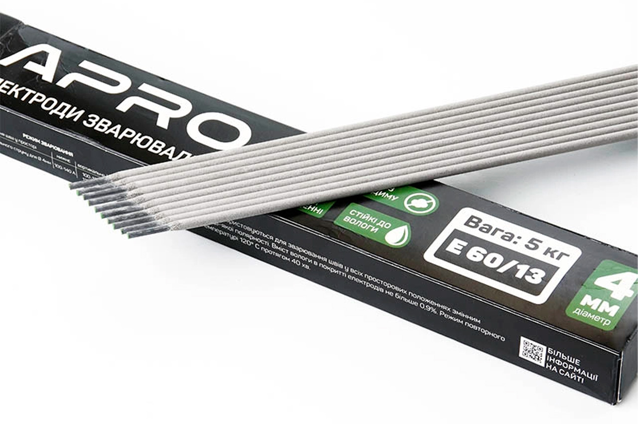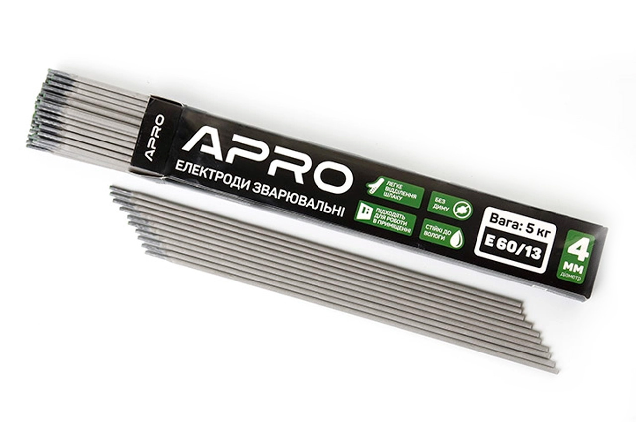 Електроди APRO Е 60/13 призначені для зварювання конструкцій із низьковуглецевих і низьколегованих сталей із межею плинності до 380 МПа у всіх просторових положеннях на постійному та змінному струмі. Електроди можуть добре перекрити порівняно широкі щілини, малочутливі до якості підготовки крайок, наявності гальванічних покриттів, іржі та інших поверхневих забруднень. Електроди Е 60/13 вирізняються легким початковим і повторним запалюванням, м'яким і стабільним горінням дуги, забезпечують мінімальне розбризкування металу під час зварювання, рівномірне плавлення покриття, чудове формування металу шва, легке відділення шлакової кірки. Електроди Е 60/13 не димлять, а тому допускаються для зварювальних робіт у приміщенні.