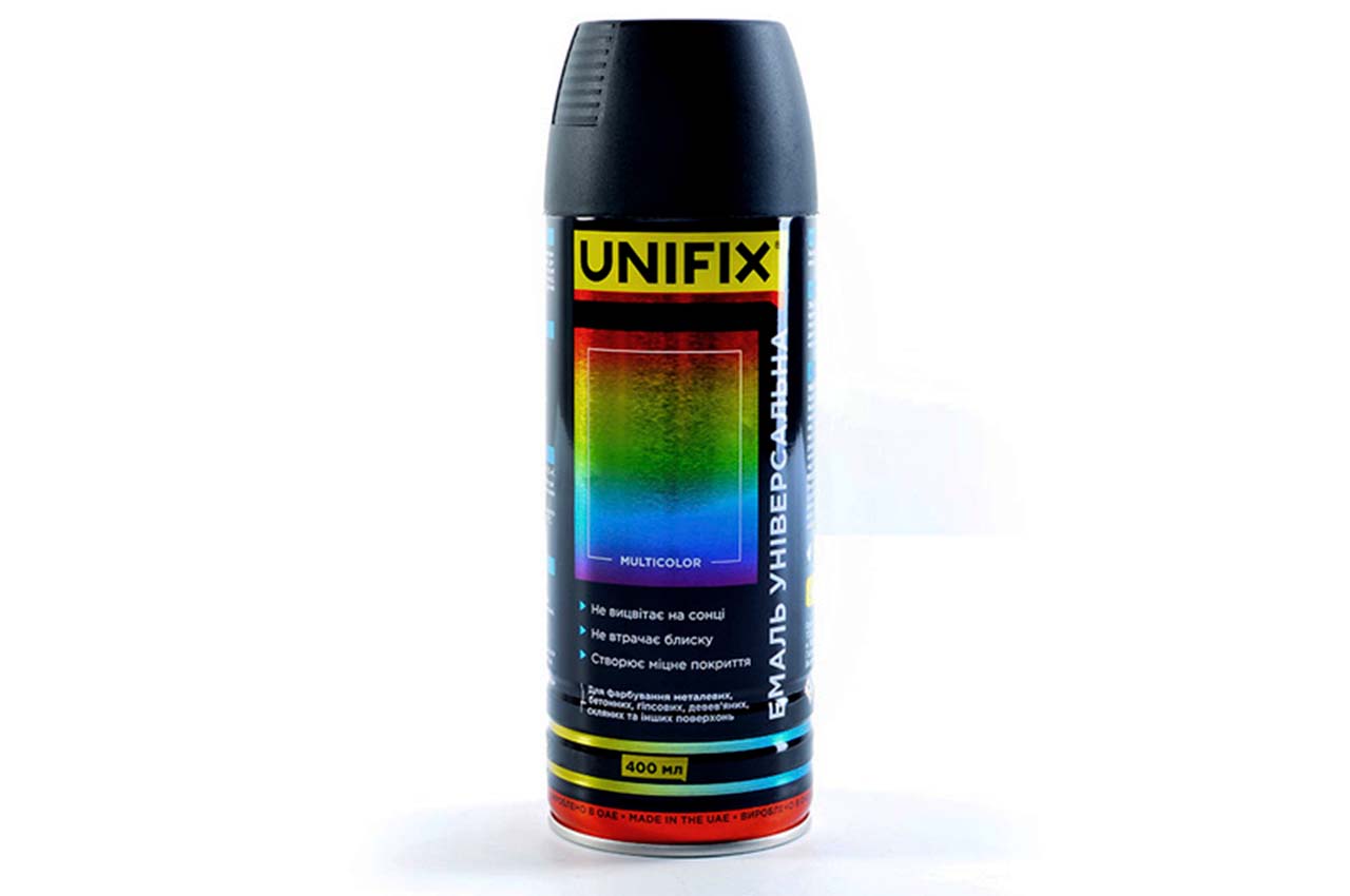 Емаль універсальна Unifix - 400мл RAL 9005 чорний мат для фарбування металевих, бетонних, гіпсових, дерев'яних, скляних та інших поверхонь. Зручна для роботи із трафаретами. Утворює міцне глянсове покриття, стійке до механічних та атмосферних впливів. Чи не вицвітає на сонці і не втрачає блиску. Для зовнішніх та внутрішніх робіт.