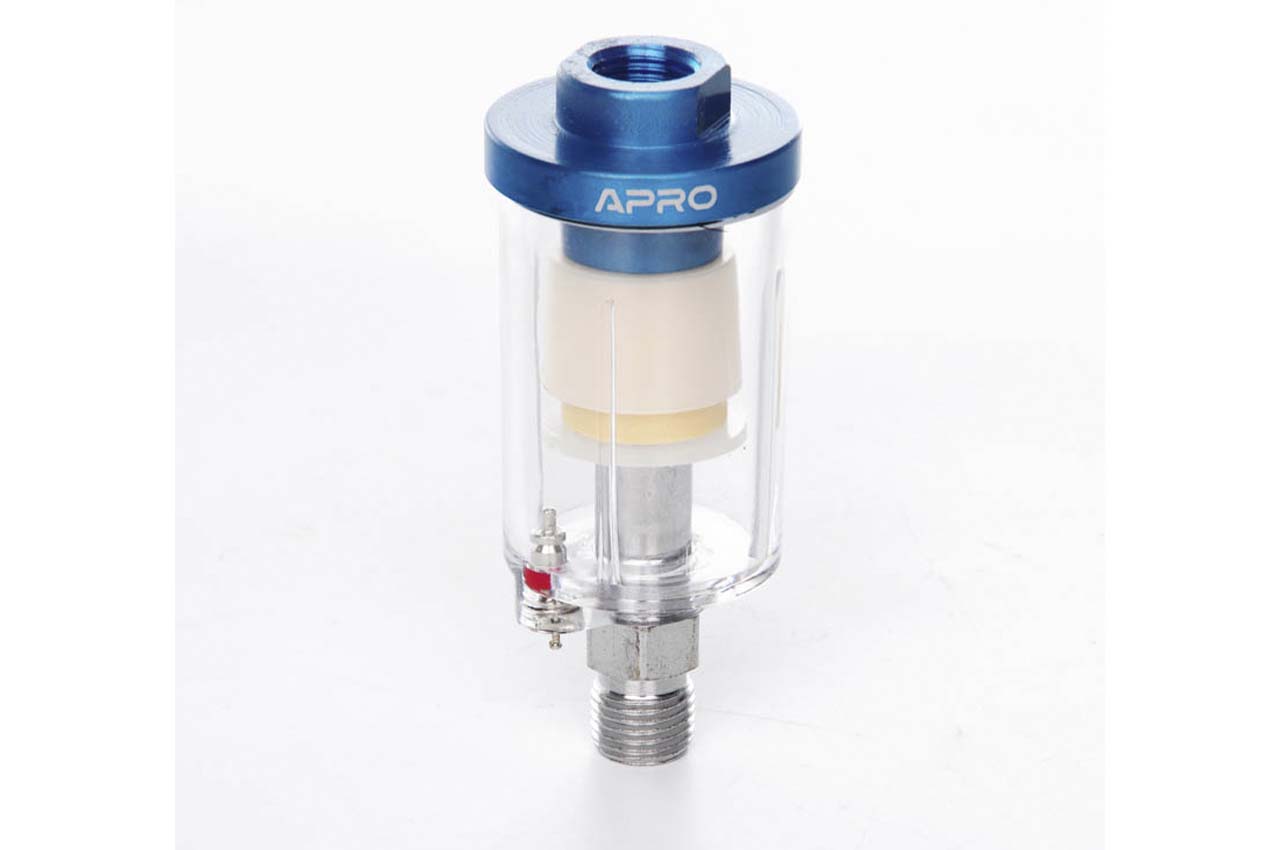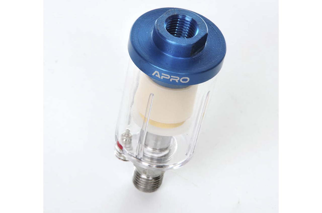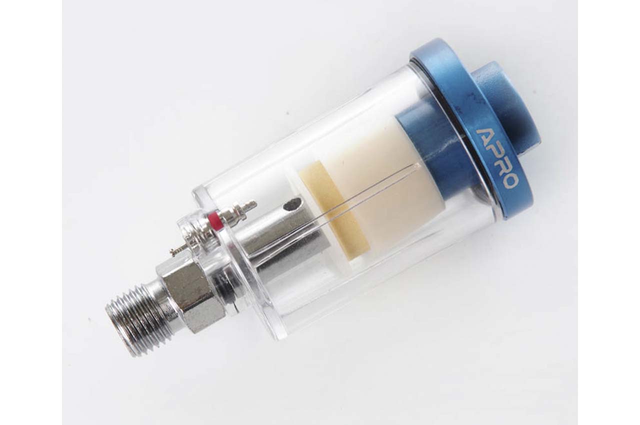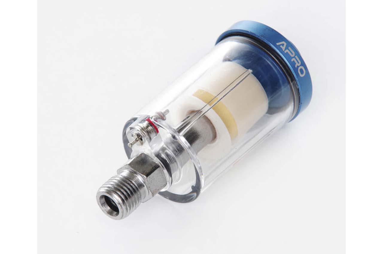 Фільтр повітряний Apro - призначений для фільтрації повітря, що подається безпосередньо перед фарбопультом. Він ефективно очищає повітря на вході в пістолет, усуває залишки твердих частинок, води, масел і бруду. Рівень фільтрації: 5 мкм.