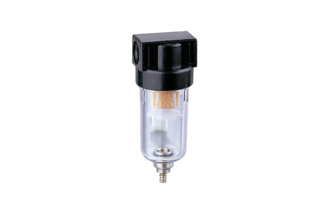Фільтр очищення повітря необхідний для якісного фарбування фарбопультом або для безперебійної роботи пневмоінструменту. Очищає повітря з компресора від вологи, масла і пилу. Вловлює дрібні частинки до 20 мікрон. Внизу колби встановлений клапан для скидання накопичився масла і вологи. Особливості Фільтруючий елемент виготовлений зі спіненого металу; Автоматичний дренаж. Повітряний фільтр встановлюють безпосередньо після виходу з компресора. У комплект не включені перехідники. Має 2 внутрішні різьблення для підключення, діаметром 1/4 ". Рівень фільтрації: до 20 мікрон; Пропускна здатність: до 400 л / хв; Діаметр шланга: 8-12 мм; Робочий тиск: до 10 атм; Діаметр різьби: 1/4 "