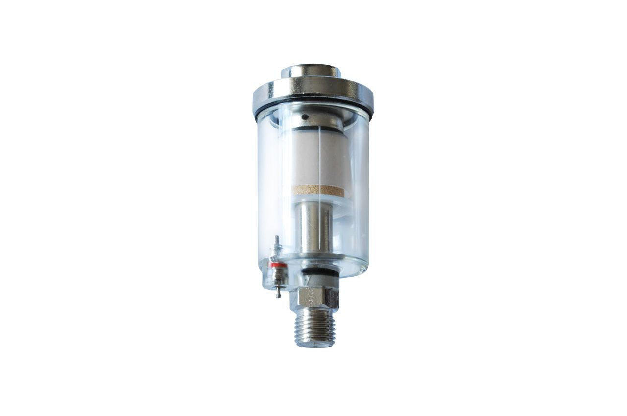 Міні фільтр необхідний для очищення стисненого повітря безпосередньо перед входом в пневмоінструмент. Різьбові з'єднання 1/4 ". Робочий тиск до 10 атмосфер. Фільтр оснащений зливним клапаном. Особливості Фільтруючий елемент виготовлений зі спіненого металу - багаторазового матеріалу; Монтується безпосередньо перед краскопультом, без перехідників; Міцний - верхнє і нижнє підставу міні-фільтра виконано з металу. рівень фільтрації: до 5 мкм; Пропускна здатність: до 400 л / хв; Діаметр шланга: 6-8 мм; Діаметр різьби: 1/4 "