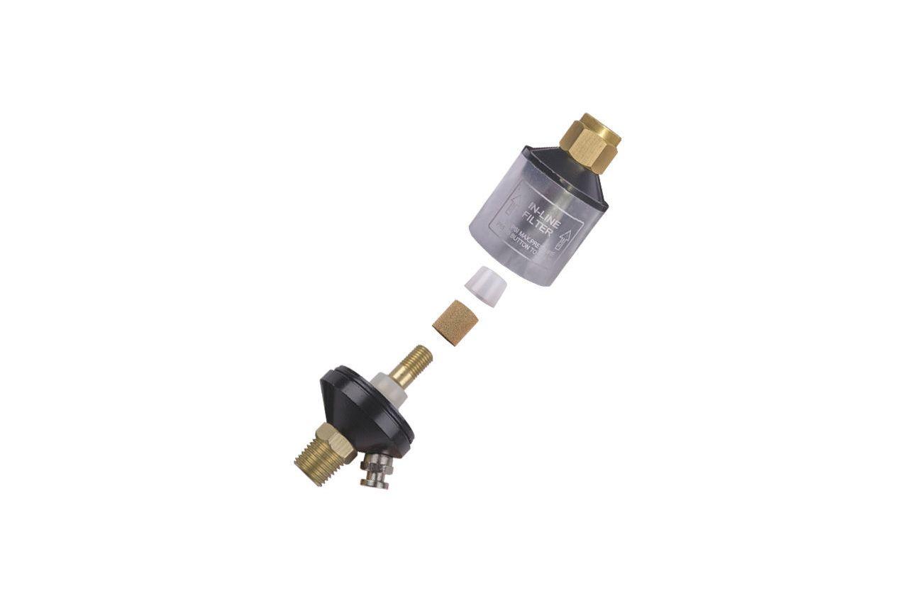 Міні-фільтр PT-1403 використовується з фарбувальними пістолетами. PT-1403 призначений для фільтрації повітря, що подається безпосередньо перед фарбувальних пістолетом. Основу міні-фільтра становить картридж з пенометалла. Завдяки картриджу з пенометалла здійснюється максимальний захист від попадання дрібних частинок в сопло фарбувального пістолета. Картридж має унікальні властивості і є багаторазовим. Щоб зберегти початкові властивості картриджа і забезпечити максимальний захист від попадання дрібних частинок, рекомендуємо періодично чистити знімний картридж в розчинниках. Міні-фільтр має металевий корпус, що при падінні або інших механічних пошкодженнях зберігає його первинний вигляд і цілісність всієї конструкції. Верхнє і нижнє підстави міні-фільтра також виконані з металу. Максимальний тиск (верхня межа) міні-фільтра становить 150 PSI або 10 Атм. Рівень фільтрації: 20 мкм; Різьба внутрішня: 1/4 "; інше: клапан для зливу конденсату; фільтруючий елемент з пенометалла; Матеріал корпусу: метал; Робочий тиск: до 10 атм; Діаметр різьби: 1/4"