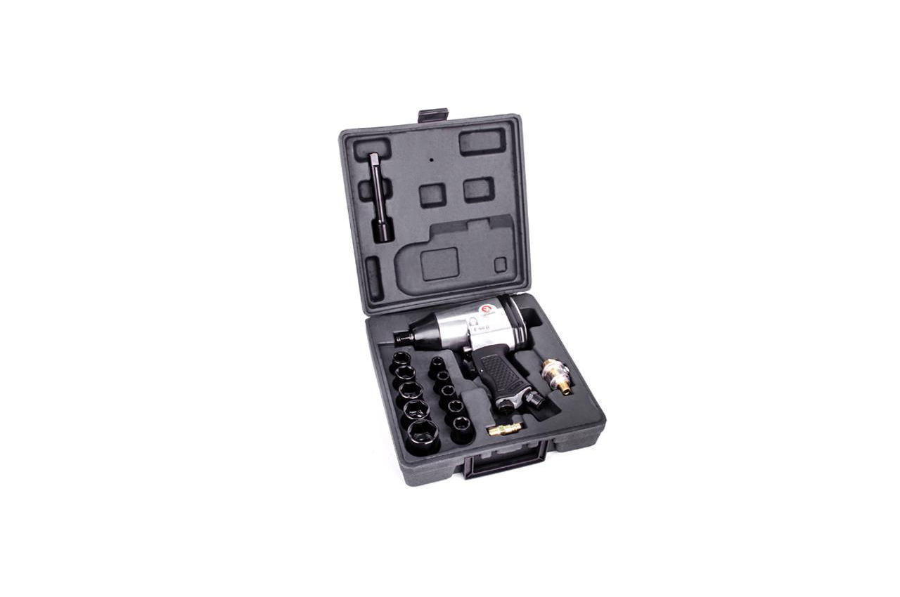 Гайковерт пневматичний інструмент професійного типу, який широко використовується в автомайстерень, на виробництві і при виконанні монтажних робіт із застосуванням кріпильних елементів з різним профілем. Ідеально підходить для шиномонтажу, а також ремонту вантажних автомобілів і техніки. Даний гайковерт має ударний механізм і функцію реверсу. Комплектується набором головок розмірами: 9, 10, 11, 13, 14, 17, 19, 22, 24 і 27 мм. Також в комплект поставки входять шестигранний ключ, лубрикатор і подовжувач. Все це укомплектовано в зручний кейс. Швидкість обертання становить 7000 об / хв, а максимальне зусилля - 345 Нм. Робочий тиск може досягати 6 атм. Рукоятка приладу прогумована. Кількість одиниць в наборі: 17 од .; Робочий тиск: до 6 атм; Максимальне зусилля: 345 Нм; Квадрат: 1/2 "; Швидкість обертання: 7000 об / хв; Наявність реверсу: да; Витрата повітря: 260 л / хв; Діаметр шланга: 8-10 мм; Покриття рукоятки: гума