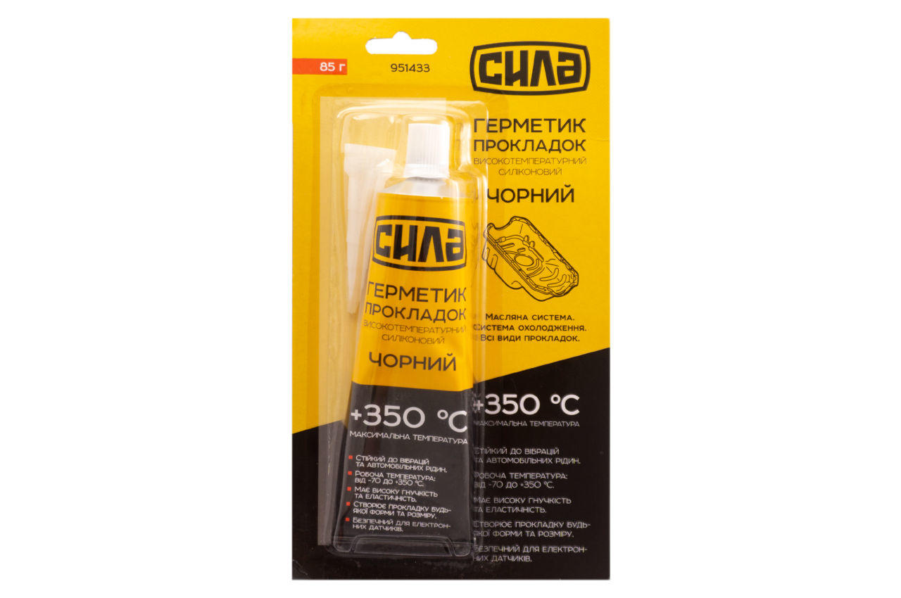 Герметик високотемпературний Сила - 85г чорний призначений для ремонту та заміни прокладок, що використовуються при високих температурах від -70 до +350°С. 100% Натуральний силікон стійкий до автомобільних рідин. Безпечний для електронних датчиків. Зберігає гнучкість та еластичність після висихання.