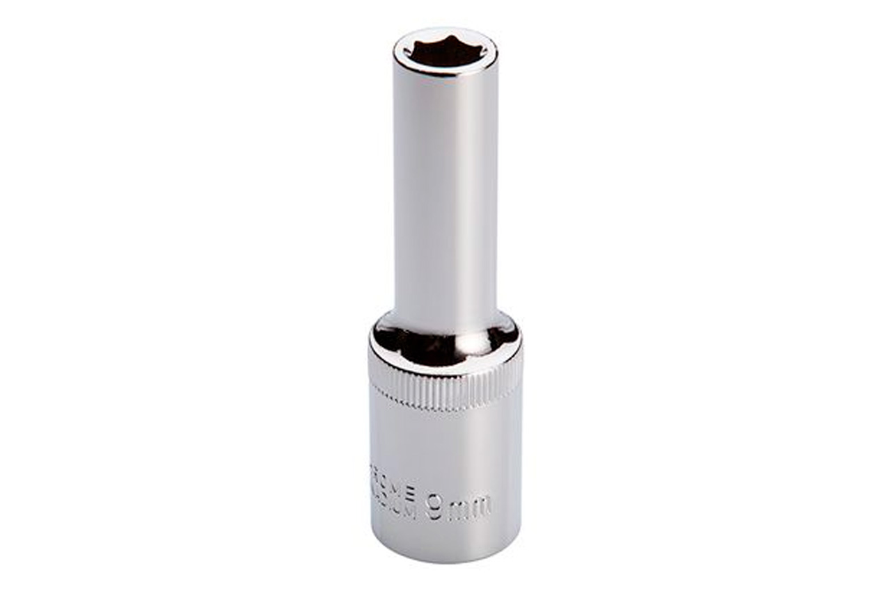 Головка торцева використовується для монтажу та демонтажу різних шестигранних різьбових з'єднань. Працює в парі з ручними інструментами з приєднувальним квадратом 1/2": з тріскачками, комірами, подовжувачами, викрутками та ін. Виконана з високоміцної Cr-V сталі з присадками хрому та ванадію, витримує значні навантаження, має велику механічну міцність. Головка подовженої форми забезпечує більший доступ до вузьких поглиблених ділянок, а також ефективного монтажу, демонтажу кріплень у важкодоступних місцях. Розмір головки: 9 мм Довжина головки: 78 мм