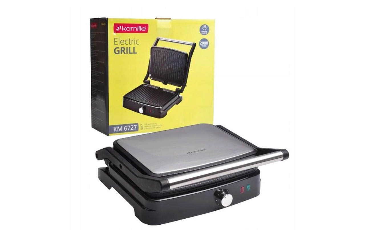 Контактний електрогриль Kamille KM 6727 це компактний та простий у використанні пристрій з одним режимом роботи, однак такий гриль добре справляється з приготуванням та стане незамінним помічником на кухні або на дачі. Він має дві прямокутні плити, які закриваються за допомогою плаваючих шарнірів, що дозволяє готувати не тільки м'ясо, але і паніні, бургери чи сендвічі, також відмінно підійде для того, щоб підсмажити овочі, котлети чи хліб до хрумкої коринки. Поверхня електрогриля покрита спеціальною антипригарною кулею, яка запобігає прилипанню їжі та полегшує її видалення після приготування. Це робить очищення приладу простішим та швидшим.