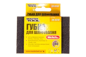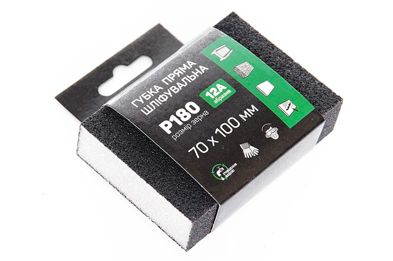 Губка для шліфування призначена для обробки поверхонь перед фарбуванням, обробки пофарбованих поверхонь, лакофарбових покриттів, шпаклівки. Дозволяє використовувати як мокрий, так і сухий метод затірки. Розміри губки: 100 x 70 x 25 мм. Зернистість: P180;