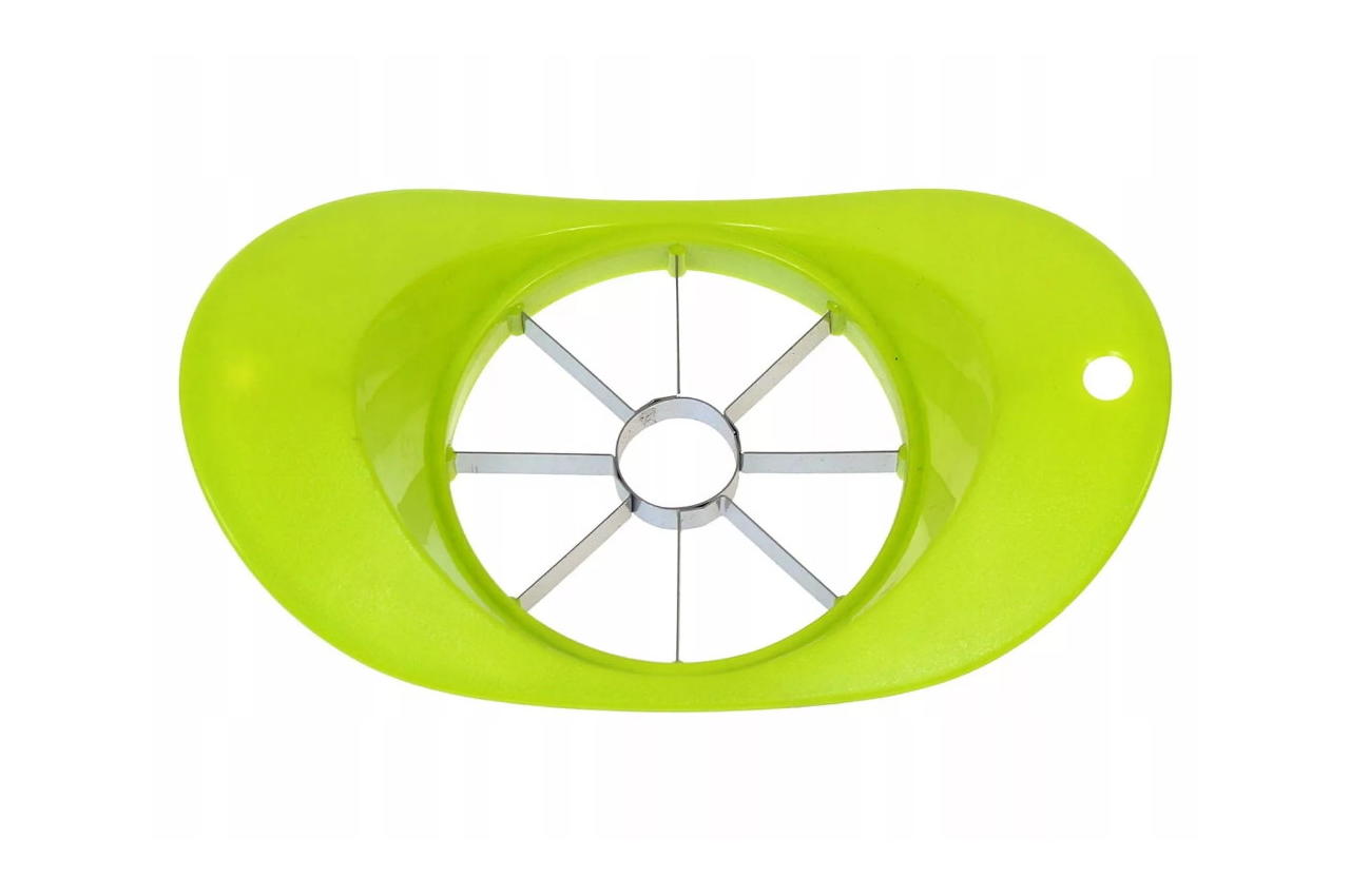 Призначений для різання яблук середнього розміру. Просто помістивши ніж на яблуко і натиснувши на нього двома руками, можна швидко розрізати яблуко на 8 рівних акуратних скибочок без серцевини та кісточок.