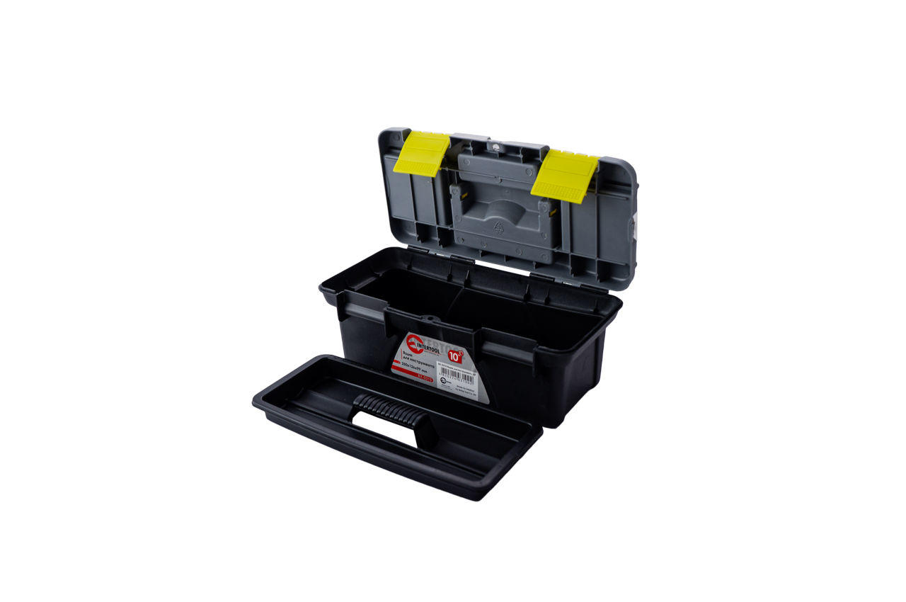 Ящик для інструменту практичний і зручний у використанні. На кришці розташовані два окремих знімних органайзера з різноманітними осередками, які відмінно підійдуть для зберігання метизів або будь-який інший дрібниці. Там же розташований відділ для зберігання отверточних насадок, який закривається прозорою кришкою. Габаритні розміри: 250х126х99 мм