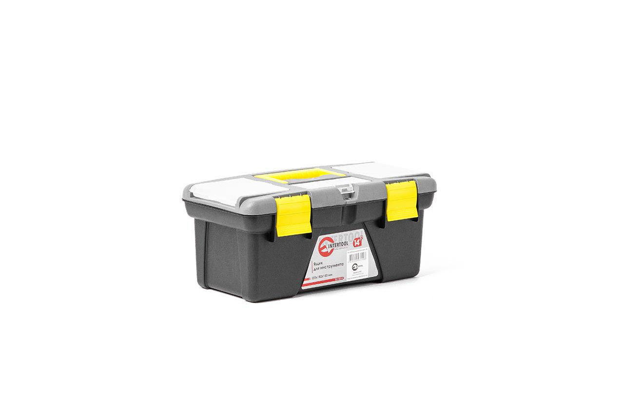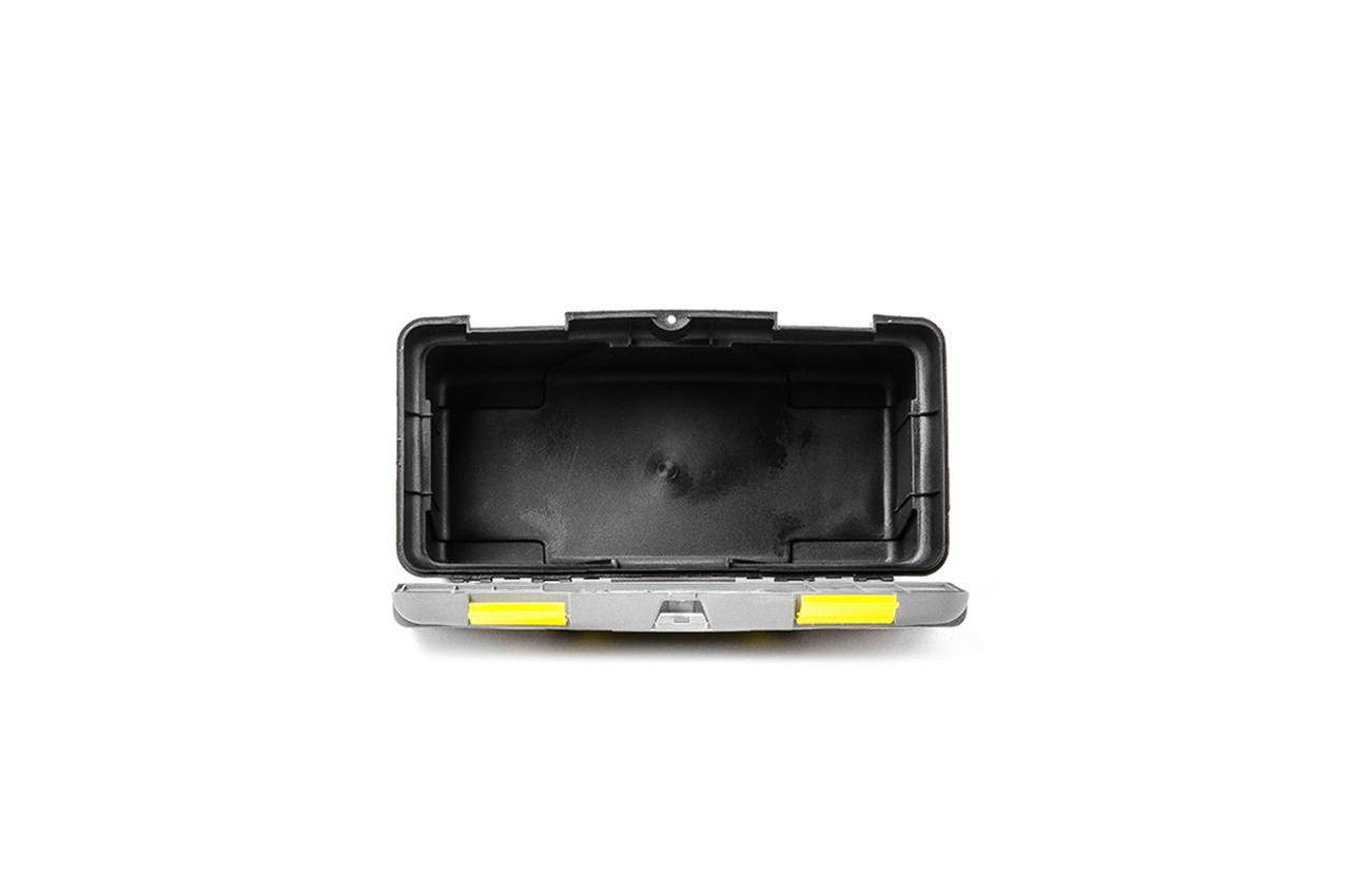 Ящик для інструменту практичний і зручний у використанні. На кришці розташовані два окремих знімних органайзера з різноманітними осередками, які відмінно підійдуть для зберігання метизів або будь-який інший дрібниці. Там же розташований відділ для зберігання отверточних насадок, який закривається прозорою кришкою. Габаритні розміри: 355х182х153 мм