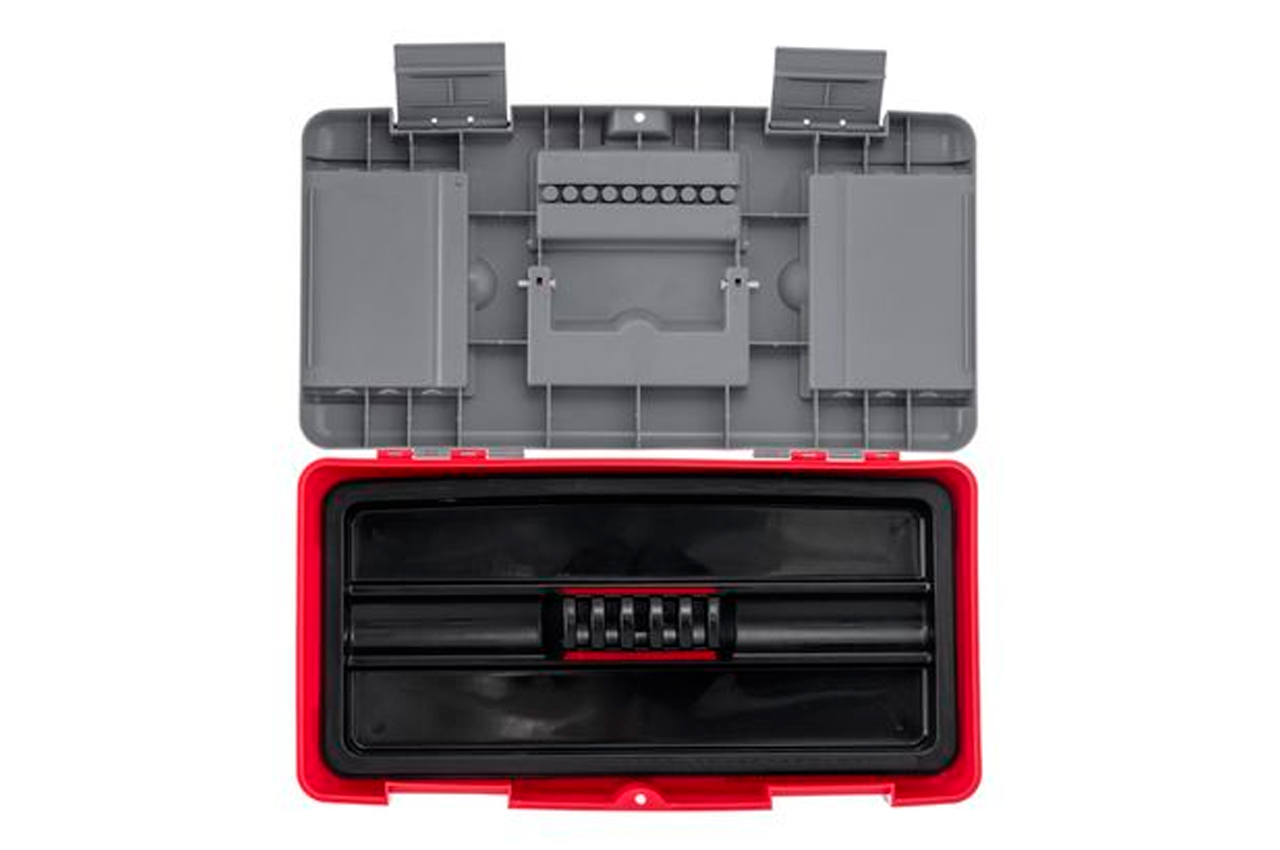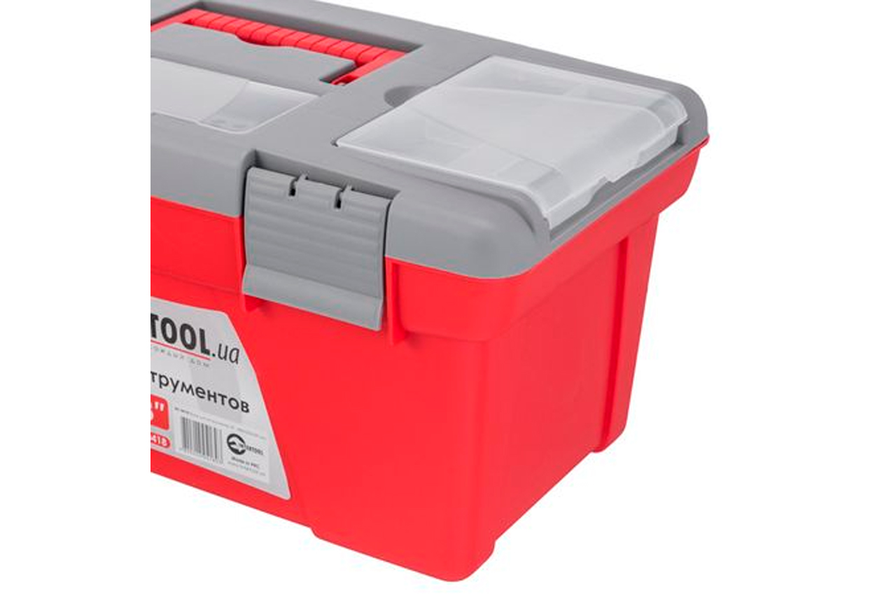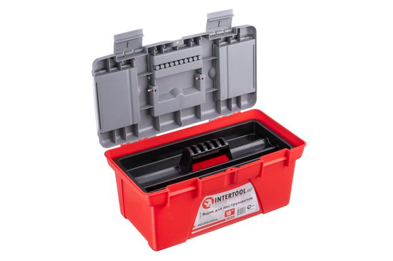 Ящик 18 "виготовлений з міцного пластику, має міцну ручку і стійкий до зовнішніх механічних впливів. Ящик має пластикові замки і додаткові пластикові бокси на кришці. Два боксу - знімні, необхідні для зберігання дрібних деталей, витратних матеріалів і т.д. А третій бокс , розташований на передній частині кришці ящика має додаткові отвори для біт (отверточних насадок), головок. Габаритні розміри ящика - 480 * 250 * 230 мм. Габаритні розміри: 480x250x230 мм