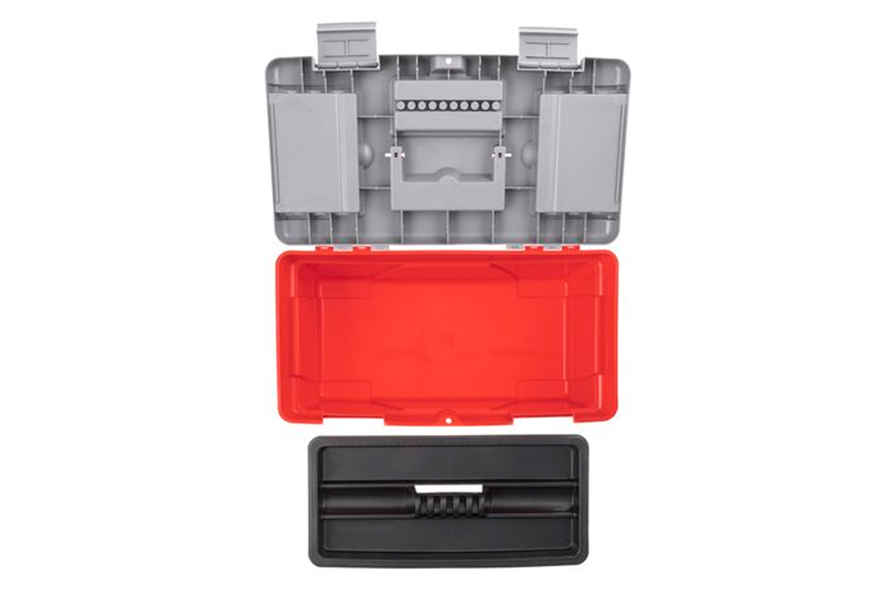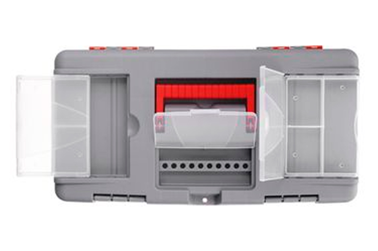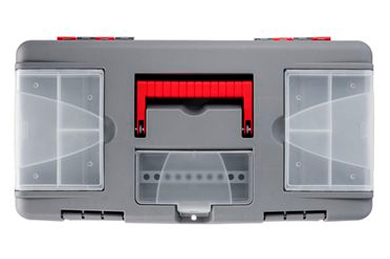 Ящик 18 "виготовлений з міцного пластику, має міцну ручку і стійкий до зовнішніх механічних впливів. Ящик має пластикові замки і додаткові пластикові бокси на кришці. Два боксу - знімні, необхідні для зберігання дрібних деталей, витратних матеріалів і т.д. А третій бокс , розташований на передній частині кришці ящика має додаткові отвори для біт (отверточних насадок), головок. Габаритні розміри ящика - 480 * 250 * 230 мм. Габаритні розміри: 480x250x230 мм