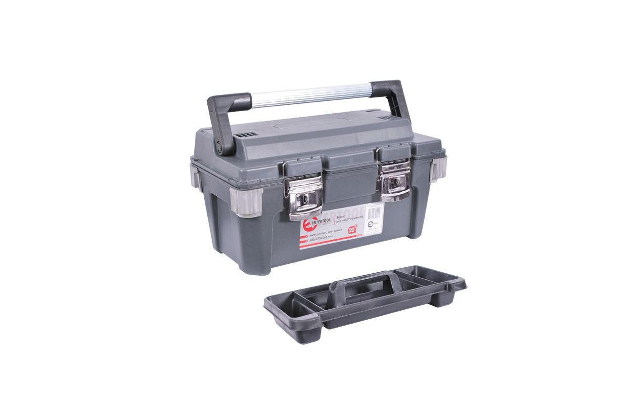 Ящик 20 "відрізняє наявність довгої рукоятки з алюмінієвою накладкою для носіння. Довга рукоятка максимально балансує завантажений ящик з інструментами. Широкі металеві замки максимально щільно притискають кришку ящика до корпусу. На замках є додаткові петлі для навісного замка. Габаритні розміри ящика складають 500 * 275 * 265 мм. Має лоток з ручкою. Габаритні розміри: 500x275x265 мм; Діагональ: 20 "