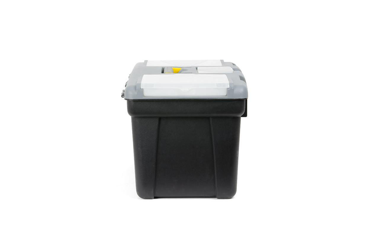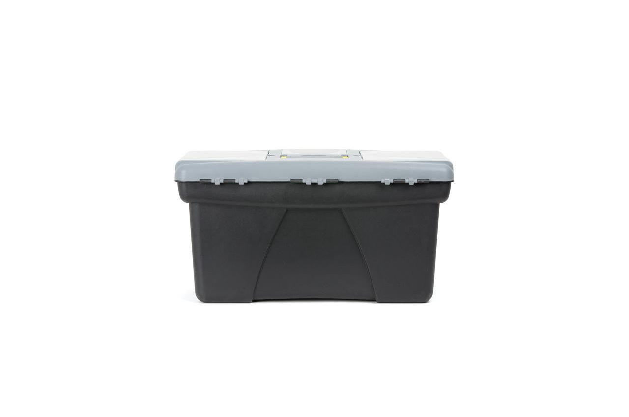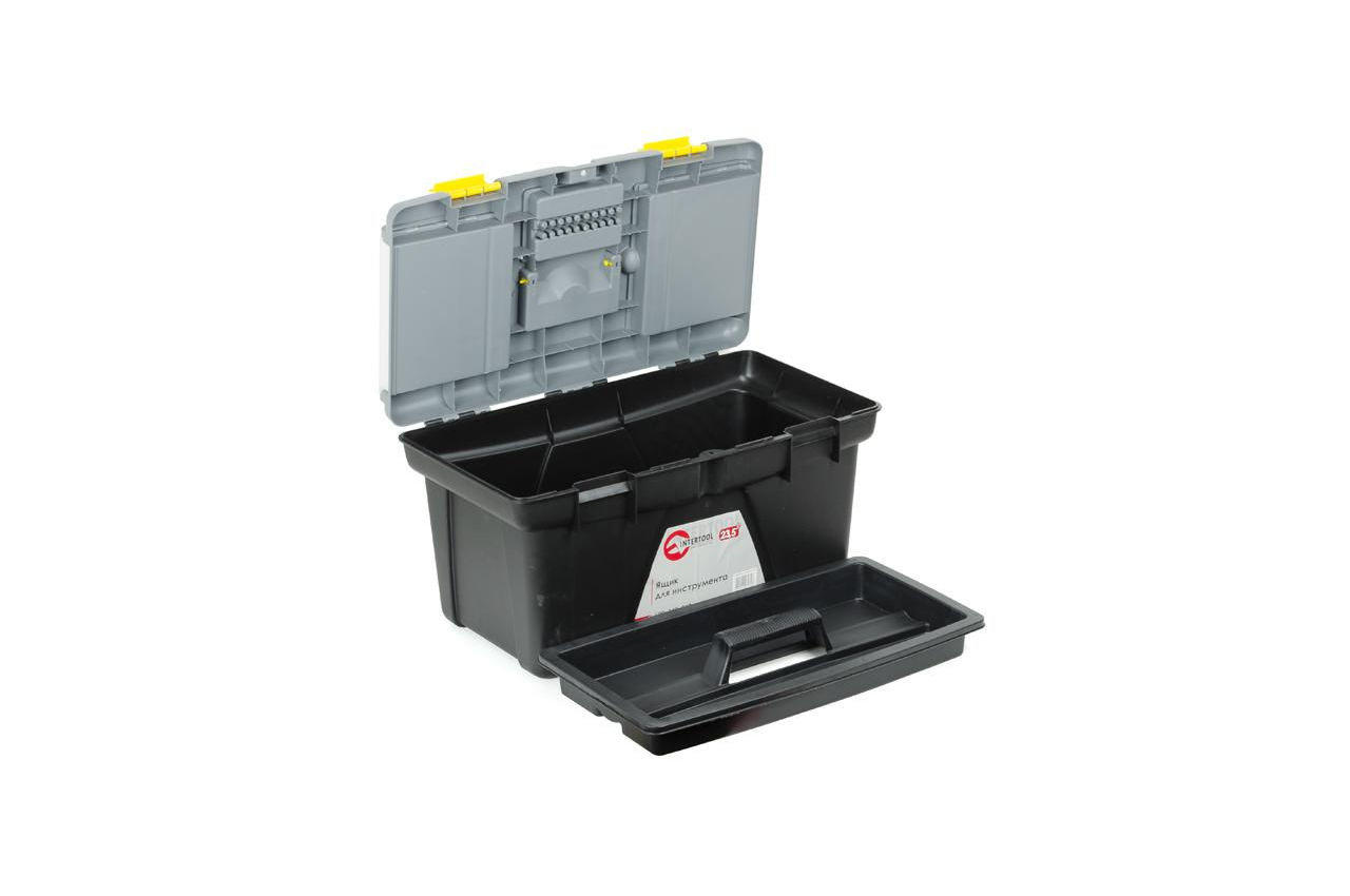 Ящик для інструменту практичний і зручний у використанні. На кришці розташовані два окремих знімних органайзера з різноманітними осередками, які відмінно підійдуть для зберігання метизів або будь-який інший дрібниці. Там же розташований відділ для зберігання отверточних насадок, який закривається прозорою кришкою. Габаритні розміри: 600х340х316 мм