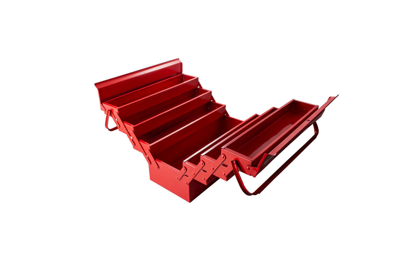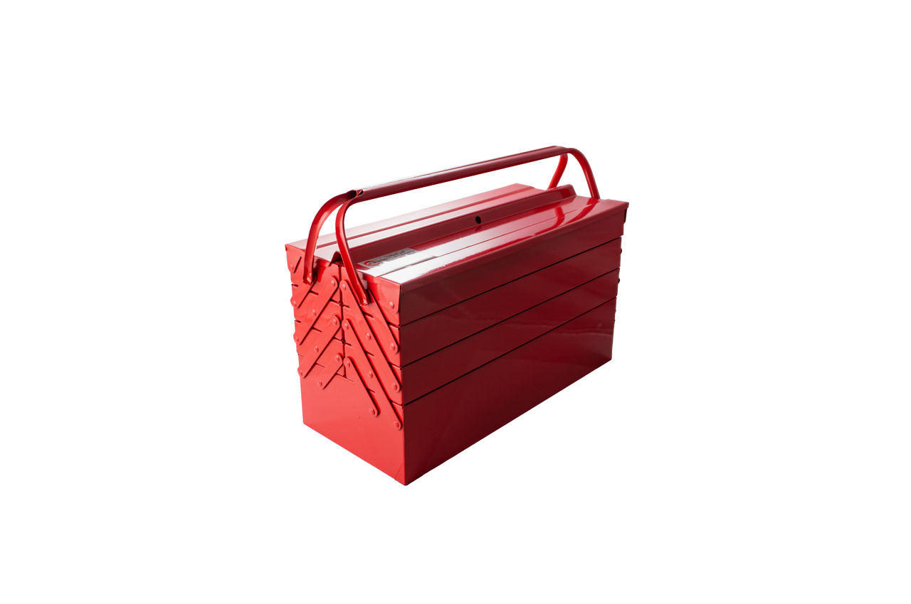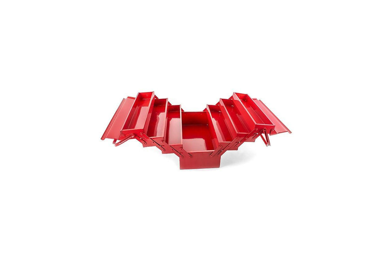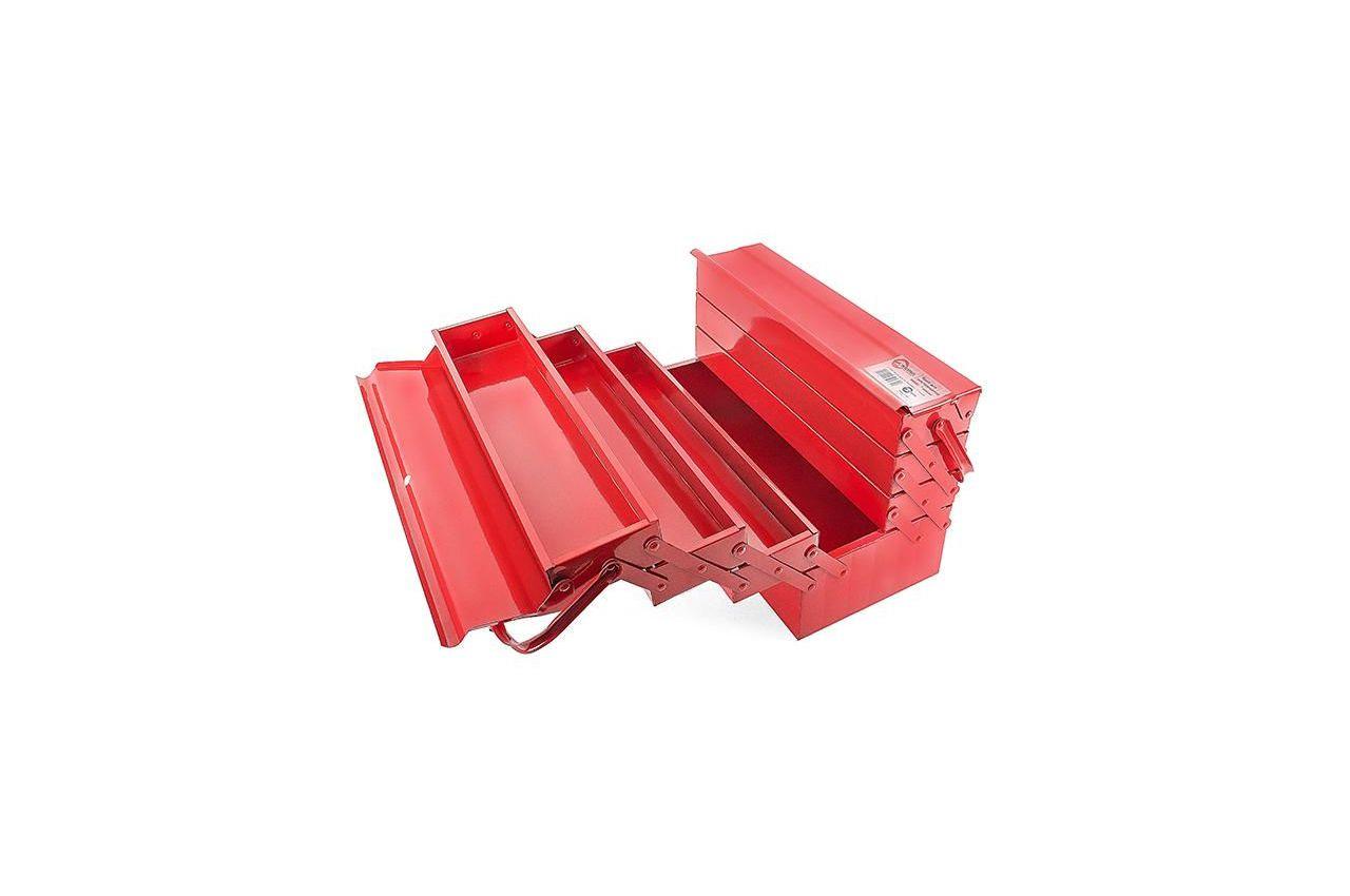 Ящик для інструментів чотирьохрівневий металевий, пофарбований. Складається з одного великого і шести малих боксів, довжина ящика 450мм. Оснащений двома металевими ручками для перенесення. Зручна система доступу до вмісту - малі бокси роз'їжджаються в сторони, забезпечуючи повний огляд внутрішнього простору кожного з них. Кількість секцій: 7 од.