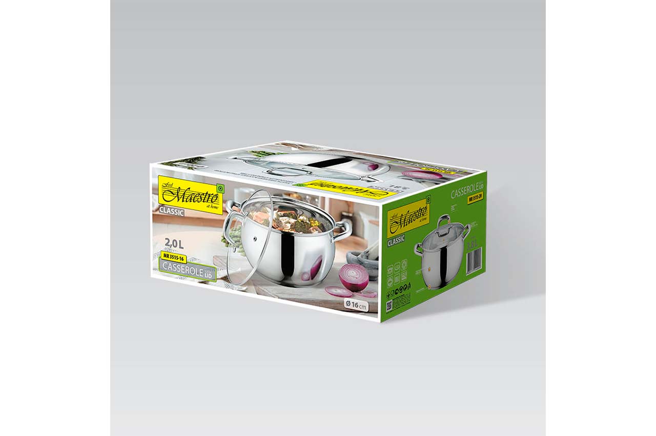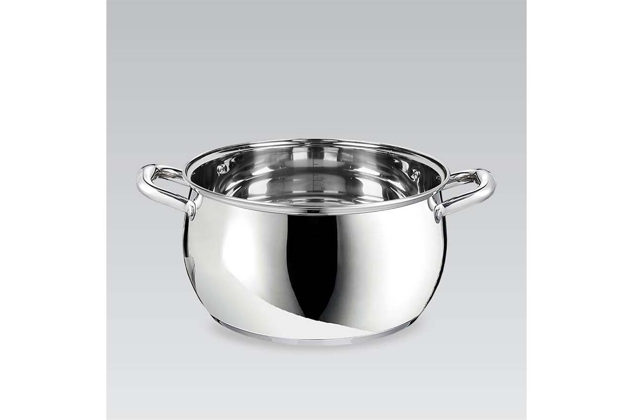 Каструля Маестро MR 3515-16. Сучасний дизайн, блискуча полірування та красиві округлі ручки. Виглядає модно, сучасно і в той же час затишно. Завдяки округлому дизайну вміщує більше рідини, ніж аналогічні моделі із прямими стінками.