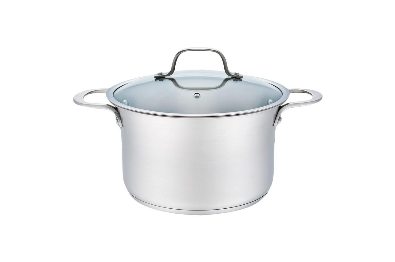 Каструля з нержавіючої сталі з багатошаровим дном. Кришка скляна, жароміцний з паровідводом. Можливо використовувати на всіх типах плит. Можливо мити в посудомийній машині.