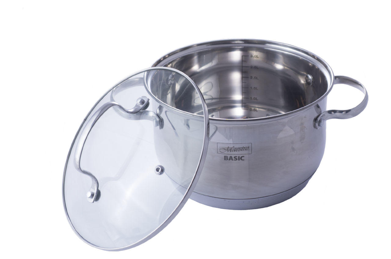 Каструля Maestro MR 3512-20 об'ємом 3,9 літра, виготовлена з високоякісної нержавіючої сталі, комбінований матовий корпус з дзеркальною смугою вгорі. На передній стороні нанесено логотип Maestro Basic. Товсте термоакумулююче дно підходить для будь-яких джерел тепла, включаючи індукцію. Скляна кришка діаметром 20 см з отвором для виходу пари та захисним сталевим обідком по периметру.