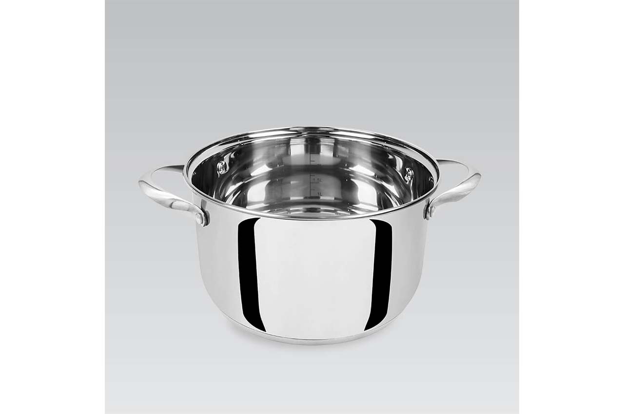 Акуратна модель маєстро MR 3519-22. Каструля виконана у сучасному дизайні. Полірування дзеркальне, каструлька звужена до низу, що надає їй витонченості. Є шкала рівня рідини. Ручки на заклепках.