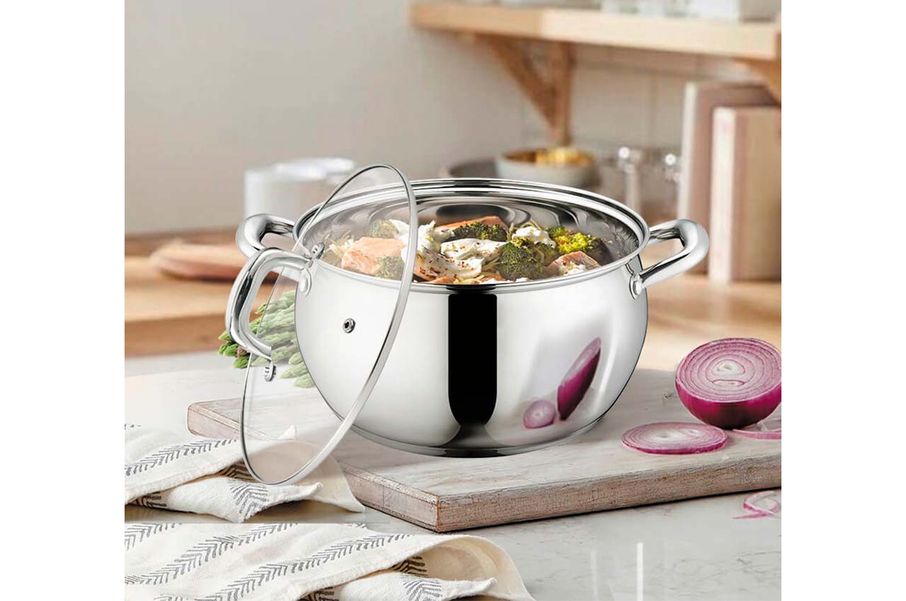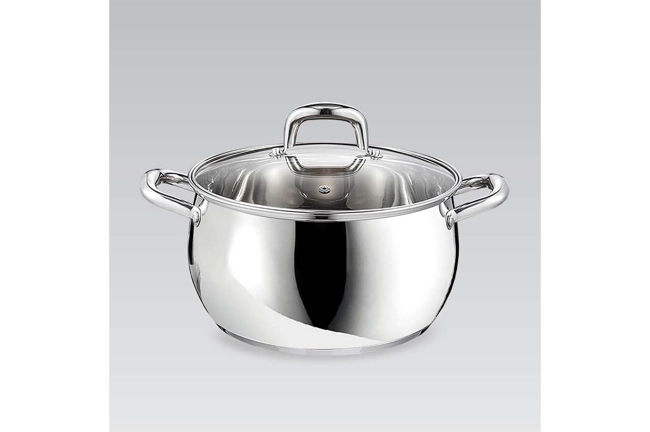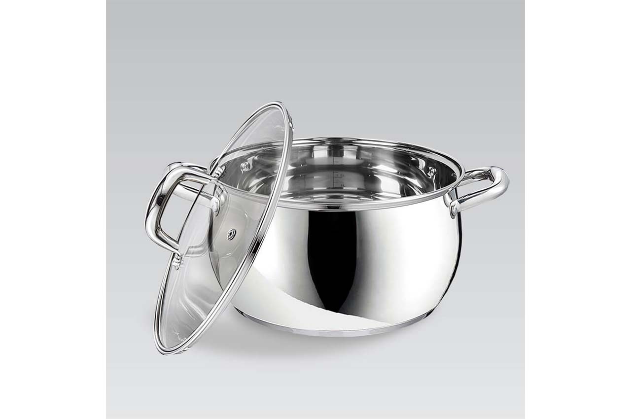 Каструля Маестро MR-3515-22. Сучасний дизайн, блискуча полірування та красиві округлі ручки. Виглядає модно, сучасно і в той же час затишно. Завдяки округлому дизайну вміщує більше рідини, ніж аналогічні моделі із прямими стінками.