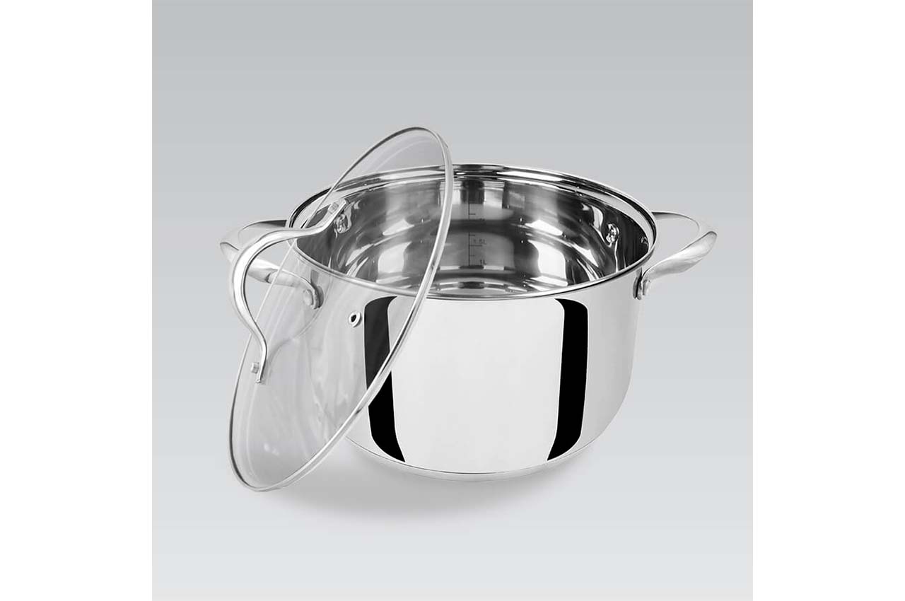 Акуратна модель маєстро MR 3519-24. Каструля виконана у сучасному дизайні. Полірування дзеркальне, каструлька звужена до низу, що надає їй витонченості. Є шкала рівня рідини. Ручки на заклепках.
