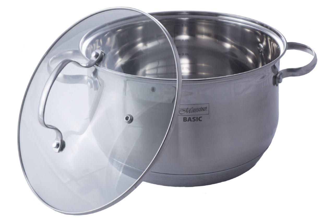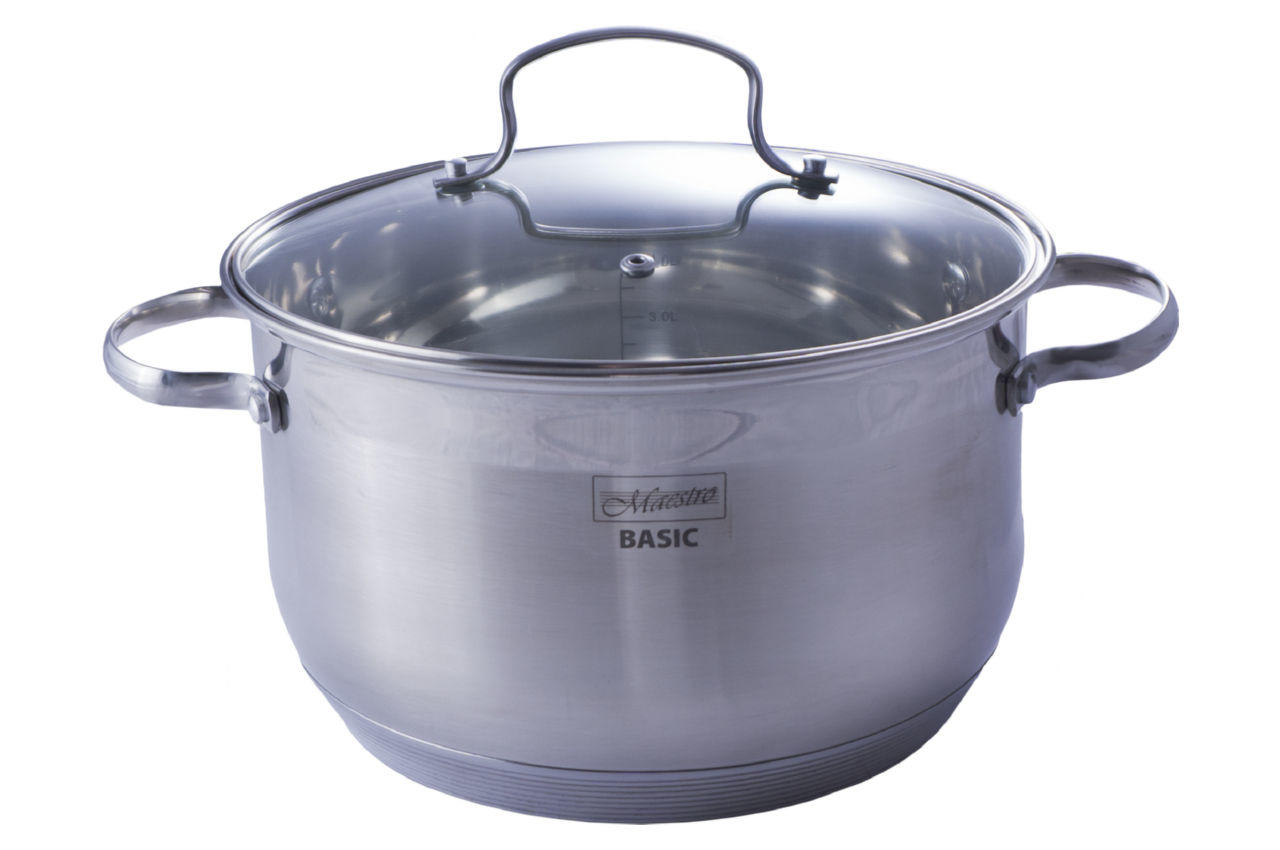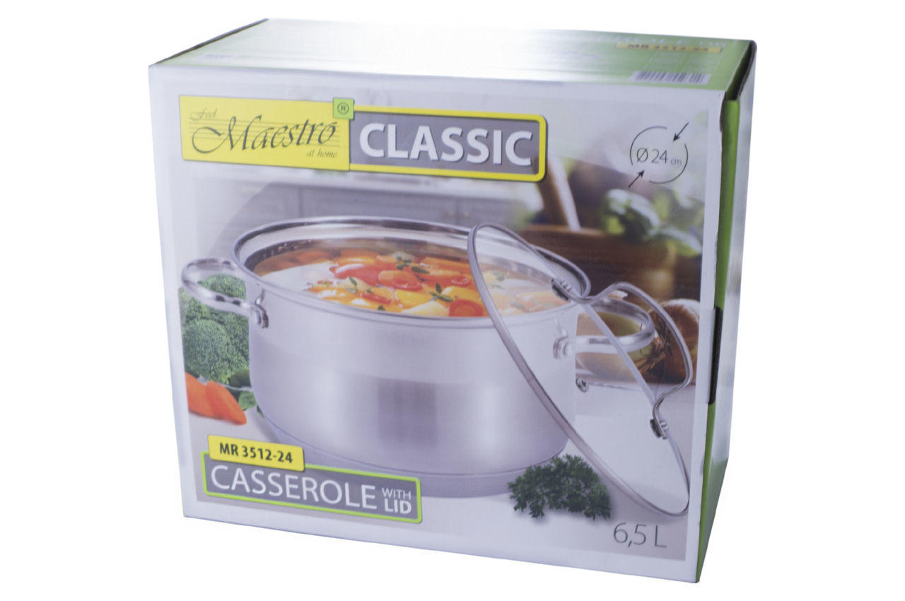 Каструля Maestro MR 3512-24 об'ємом 6,5 літра, виготовлена з високоякісної нержавіючої сталі, комбінований матовий корпус з дзеркальною смугою вгорі. На передній стороні нанесено логотип Maestro Basic. Товсте термоакумулююче дно підходить для будь-яких джерел тепла, включаючи індукцію. Скляна кришка діаметром 24 см з отвором для виходу пари та захисним сталевим обідком по периметру.