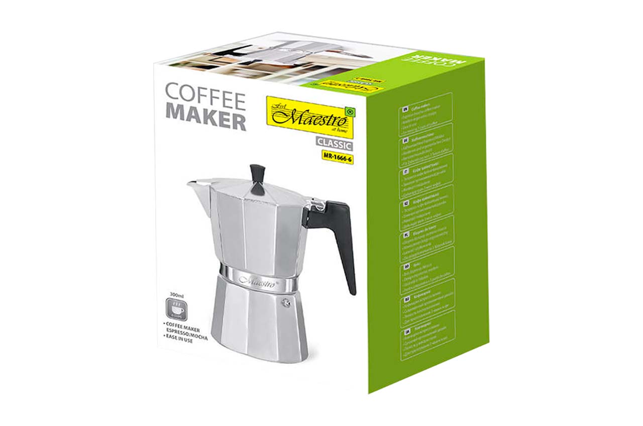 Кавоварка Maestro MR-1666-6 стане Вашим помічником на кухні для приготування чудового напою. Розрахована на 6 чашок кави. Великим плюсом цієї кавоварки є простота приготування кави та легкий догляд. Ви отримаєте задоволення від ароматного напою з гейзерною кавоваркою Maestro MR-1666-6, яка приготує каву за 2 хвилини. Забудьте про каву машин, які необхідно постійно чистити та обслуговувати.