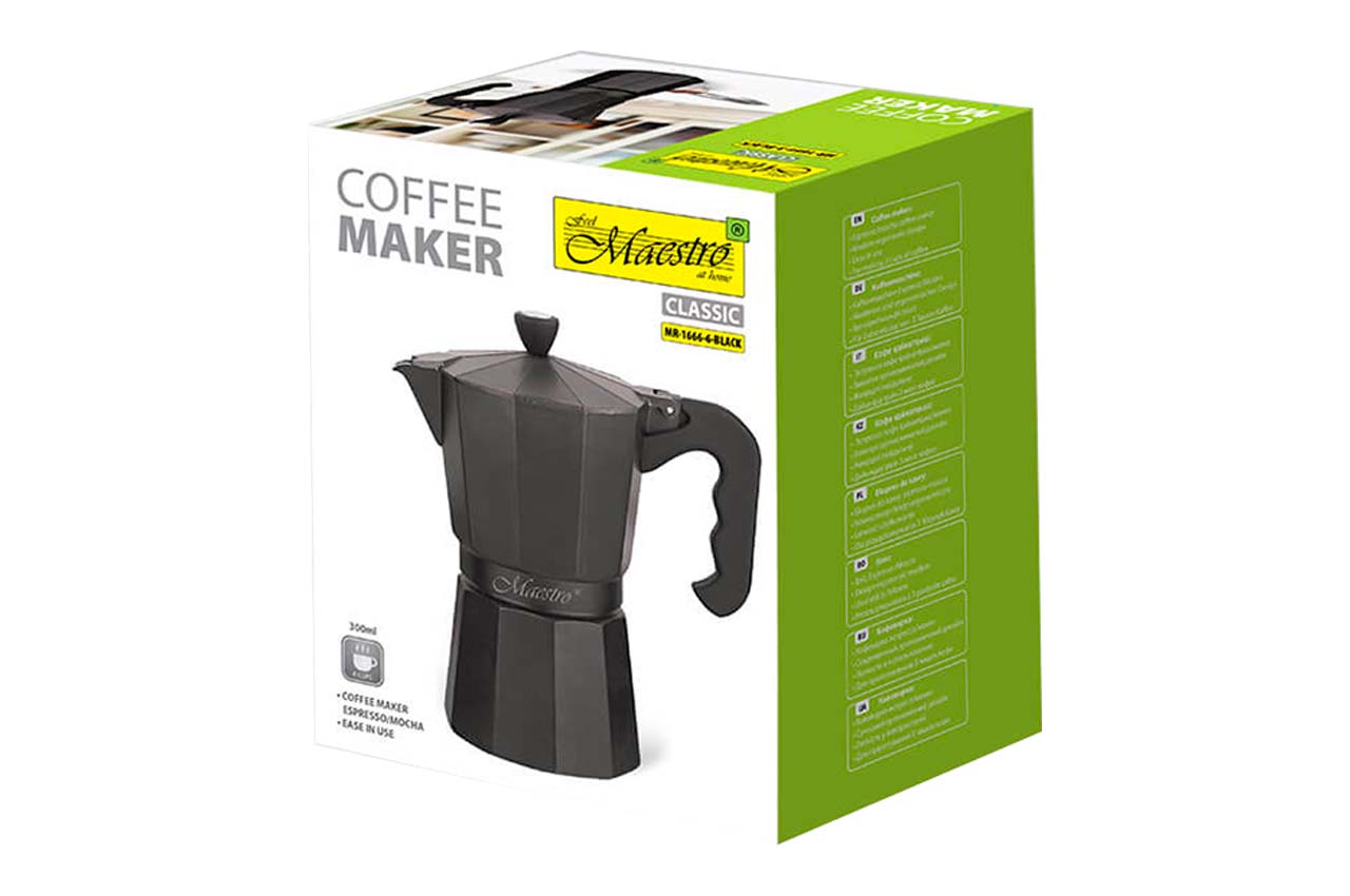 Кавоварка Maestro MR-1666-6 стане Вашим помічником на кухні для приготування чудового напою. Розрахована на 6 чашок кави. Великим плюсом цієї кавоварки є простота приготування кави та легкий догляд. Ви отримаєте задоволення від ароматного напою з гейзерною кавоваркою Maestro MR-1666-6, яка приготує каву за 2 хвилини. Забудьте про каву машин, які необхідно постійно чистити та обслуговувати