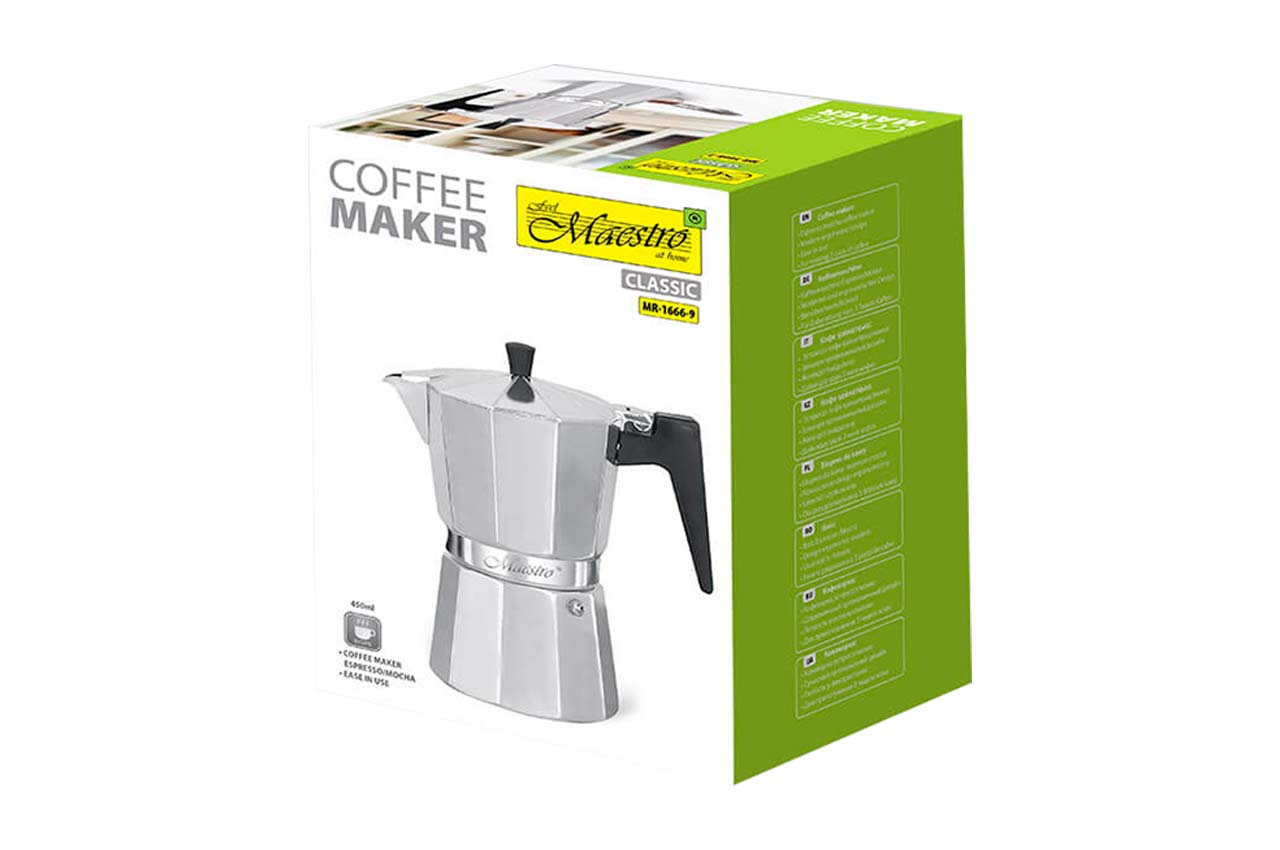 Кавоварка Maestro MR-1666-9 стане Вашим помічником на кухні для приготування чудового напою. Розрахована на 9 чашок кави. Великим плюсом цієї кавоварки є простота приготування кави та легкий догляд. Ви отримаєте задоволення від ароматного напою з гейзерною кавоваркою Maestro MR-1666-9, яка приготує каву за 2 хвилини. Забудьте про каву машин, які необхідно постійно чистити та обслуговувати