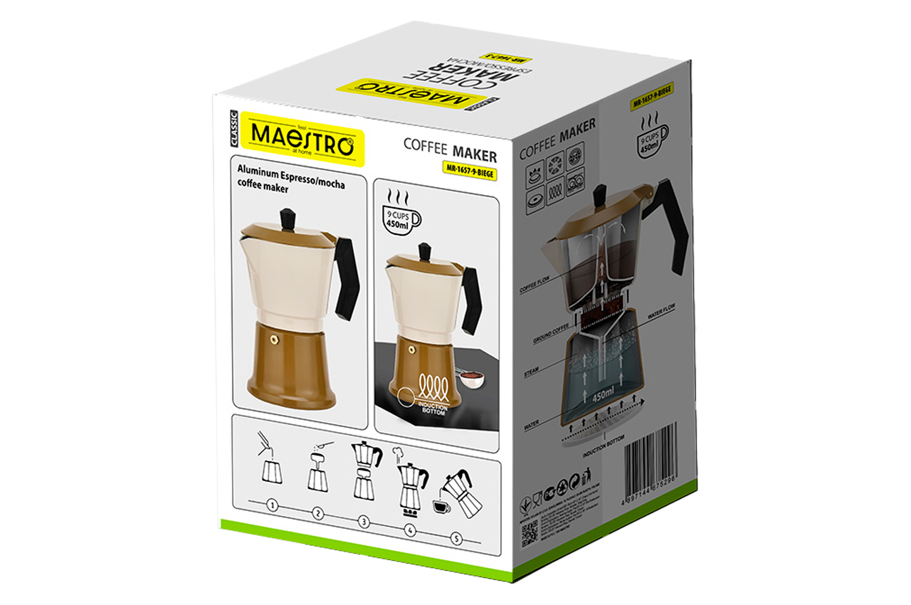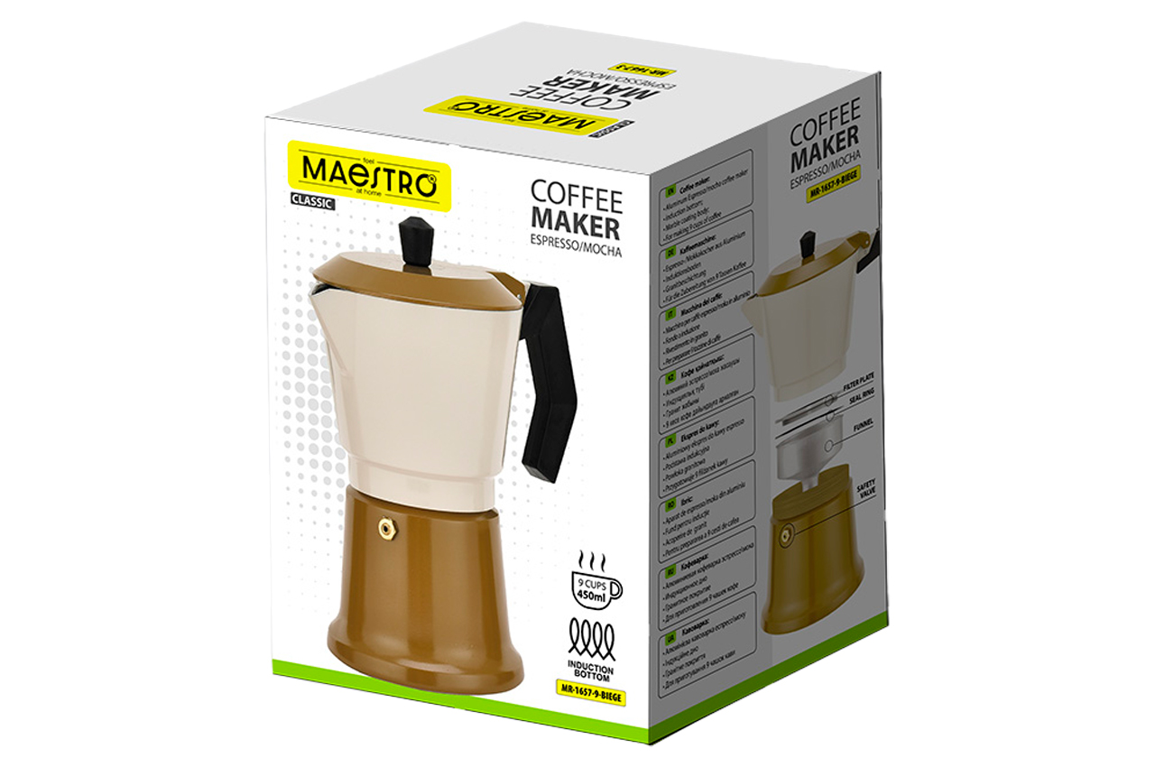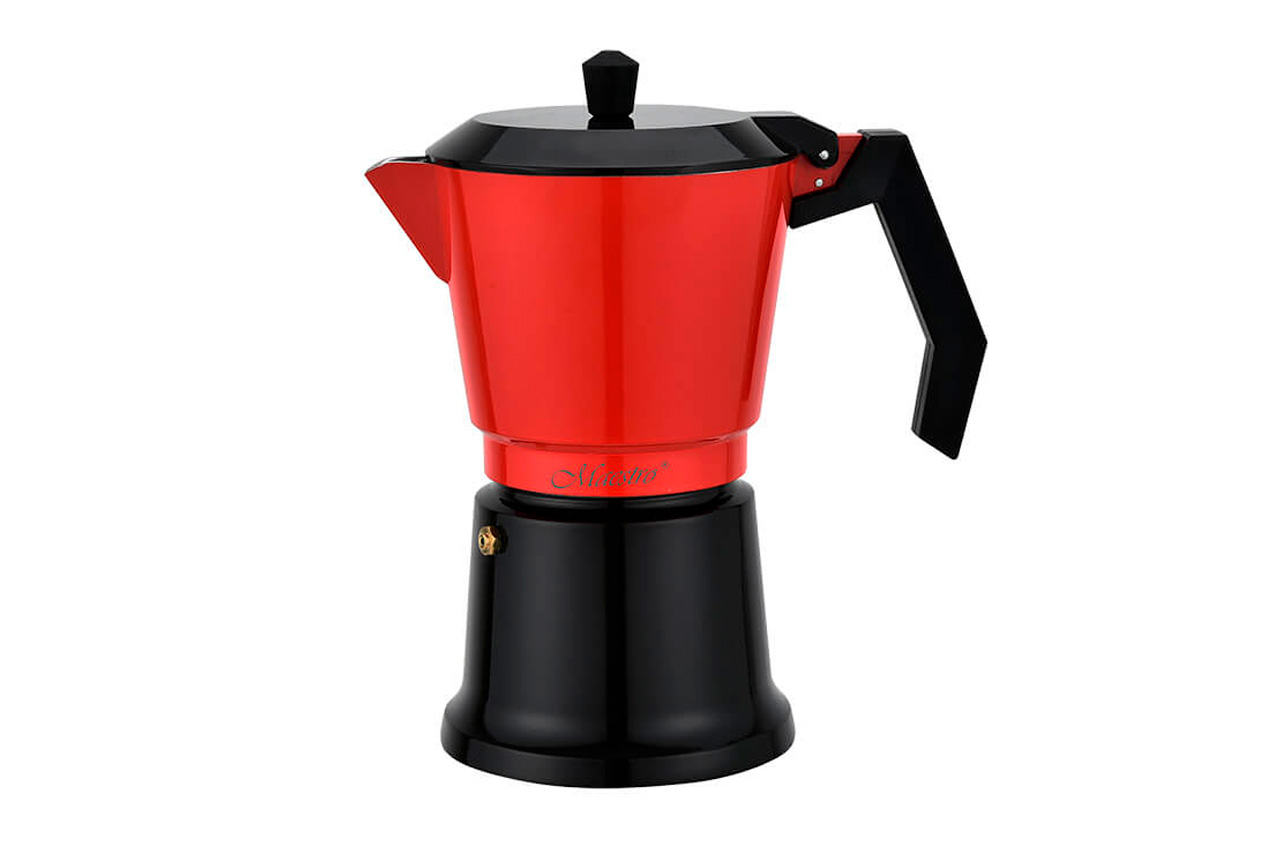 Гейзерна кавоварка Maestro MR 1657-9 чорно-червоного кольору призначена для приготування кави як еспресо, так і мокко. Кавоварка має загальний обсяг (верхній + нижній відсік) 900 мл, що відповідає дев'яти чашкам кави еспресо. Вихід кави за одне приготування 450 мл
