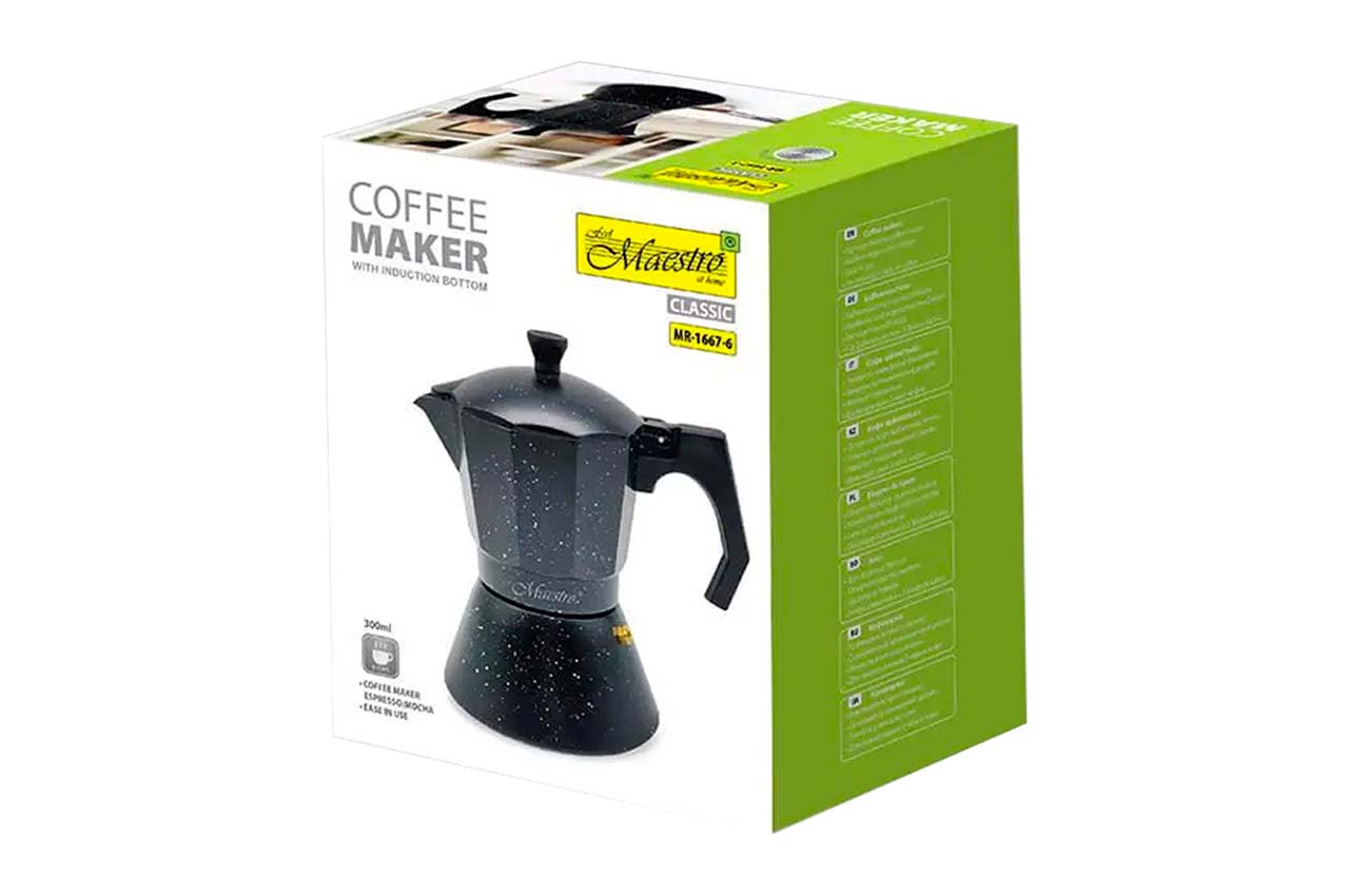 Гейзерна кавоварка Maestro MR-1667-9 призначена для приготування кави як еспресо, так і мокко. Ця модель оснащена залізним диском, вплавленим у дно. Тому підходить для індукційних плит. Розрахована на 9 чашки кави.