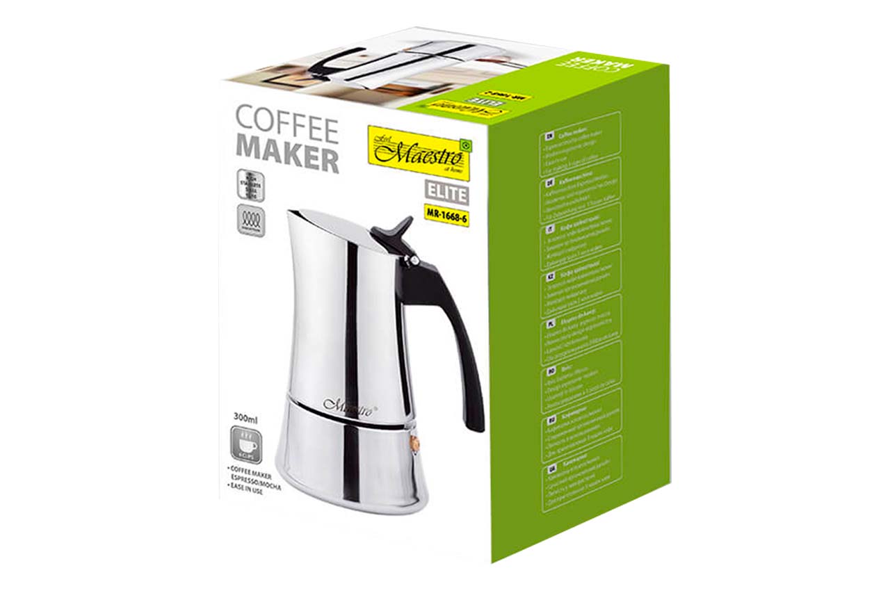 Кавоварка MR-1668-6 ця кавоварка еспресо/мокко має сучасний ергономічний дизайн. Можливе використання на всіх типах плит Для приготування 6 чашок кави Об'єм: 300 мл Матеріал: нержавіюча сталь
