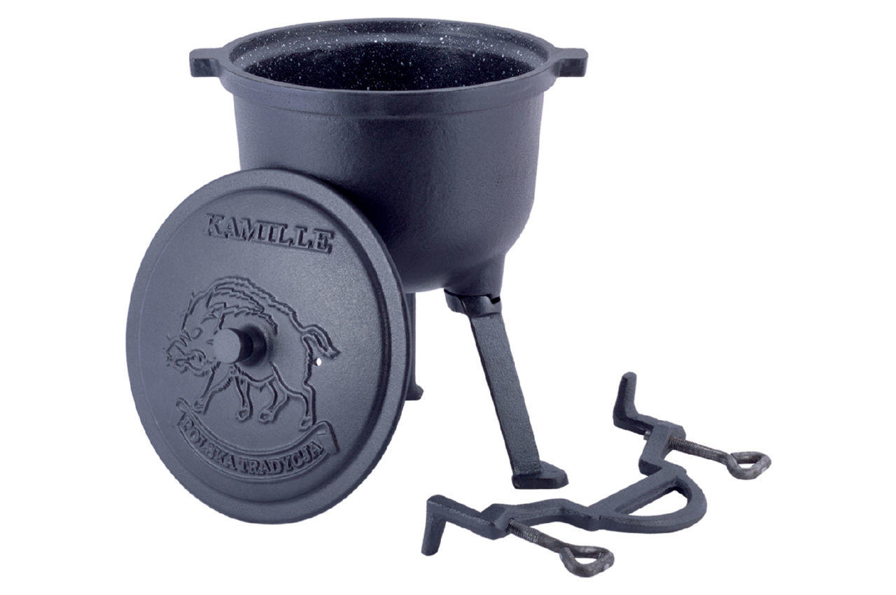 Казан Kamille — ексклюзивна пропозиція нашого інтернет-магазину. Завдяки міцному емальованому покриттю, такий казан стійкий до механічних впливів, за рахунок чого значно збільшується термін його служби. Казан нагрівається рівномірно, не створюючи перегрітих ділянок і холодних країв, навіть у тих випадках, коли процес приготування їжі йде на невеликому вогні. У результаті скорочується час приготування страви і зменшується ризик є суміш недосмажене або пережареної їжі. Вже після першого використання казана Ви будете дивуватися, як могли обходиться без неї раніше. Казанок чавунний на ніжках з кришкою та кріпленням об'ємом 4л. Покриття: 2-х шарове емальоване матове. Верхній діаметр: 24см. Висота казанка: 15,5 див. Висота ніжок: 14,5 див.