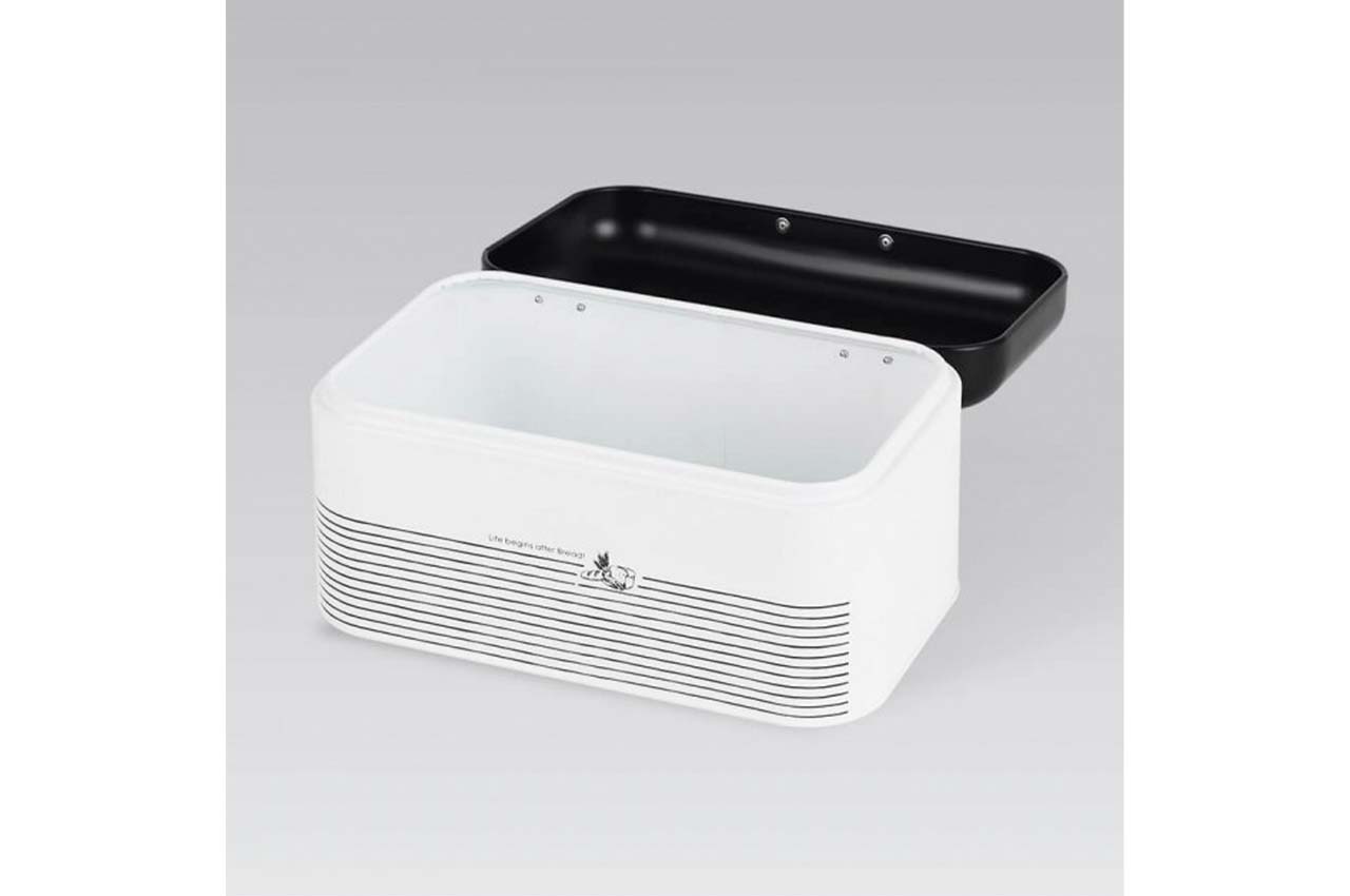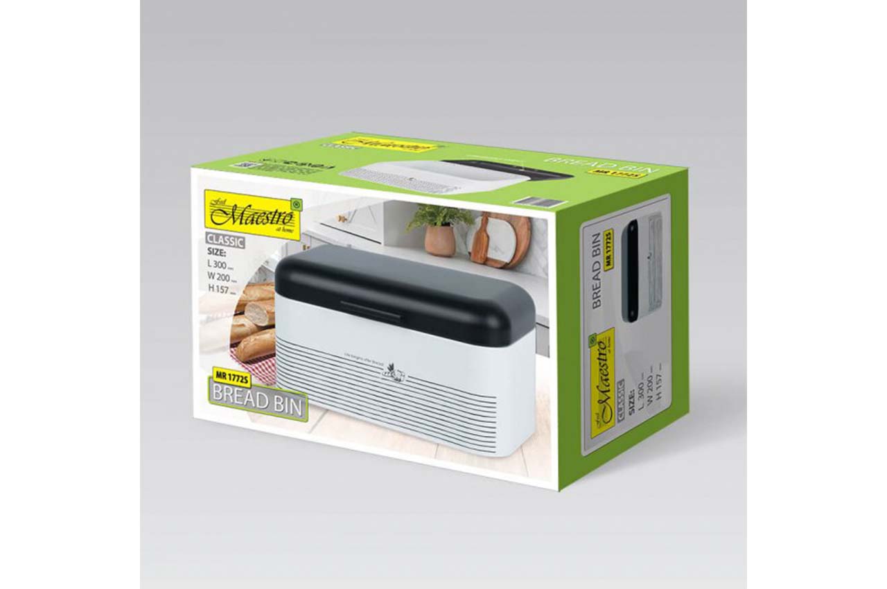 Хлібниця Maestro MR 1772-S виготовлена з металу. Короткий чорно-білий дизайн з малюнком посередині. Розмір дозволяє вмістити будь-який стандартний буханець хліба. Цей варіант виконаний у вигляді невеликої скриньки хлібної, так що, на відміну від стандартної хлібниці, можна використовувати не тільки за призначенням.