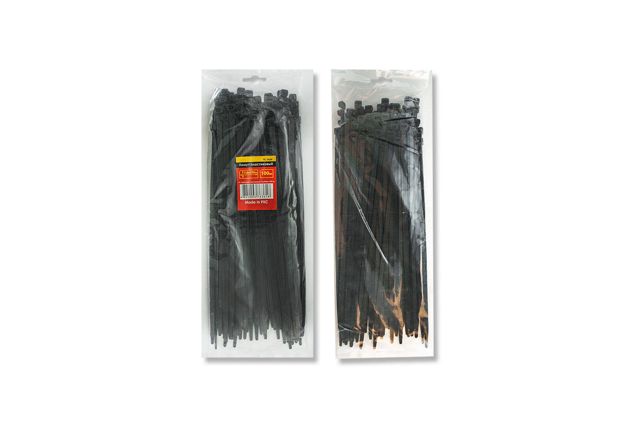 Хомут пластиковий (стяжка нейлонова) - стрічковий хомут, призначений для об'єднання проводів і кабелів в джгути (бондаж), а також кріплення до несучих елементів і напрямних при прокладанні трас. Колір чорний; Кількість в упаковці: 100 од.