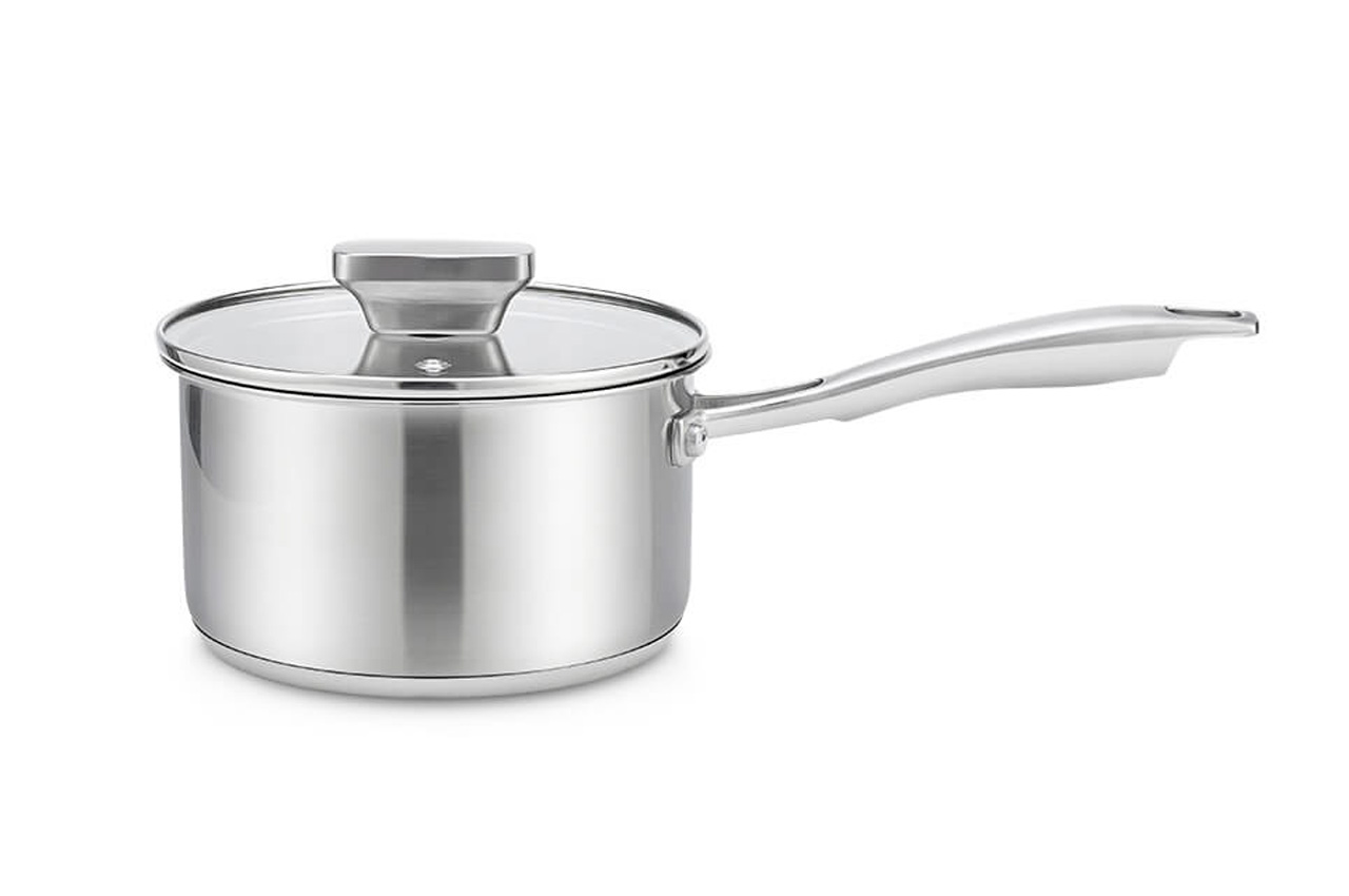 Ківш Maestro MR 3521-16S об'ємом 1,7 літра, виготовлений із високоякісної нержавіючої сталі. Модель має привабливий строгий дизайн з прямою стінкою, однакового діаметра на будь-якій висоті та рівну скляну кришку з отвором для виходу пари та захисним обідком з нержавіючої сталі по периметру. Ручка кріпиться до корпусу точковим зварюванням без заклепок. Товсте багатошарове дно з алюмінієвою вставкою сприяє швидкому та рівномірному розподілу тепла.
