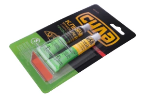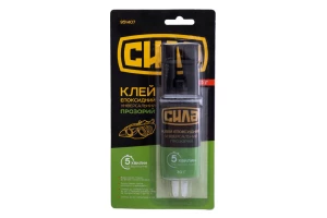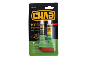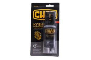 Двокомпонентний (смола + затверджувач) клей на основі епоксидної смоли. Водостійкий. Забезпечує готовність склеєних поверхонь до використання через 24 години. Зручний у використанні. На виході зі шприца ви отримуєте готовий епоксидний клей. Висока міцність затверділого клею. Не міняє колір, не тріскається і не дає усадку. Чи не проводить електрику. Призначений для склеювання виробів зі сталі.