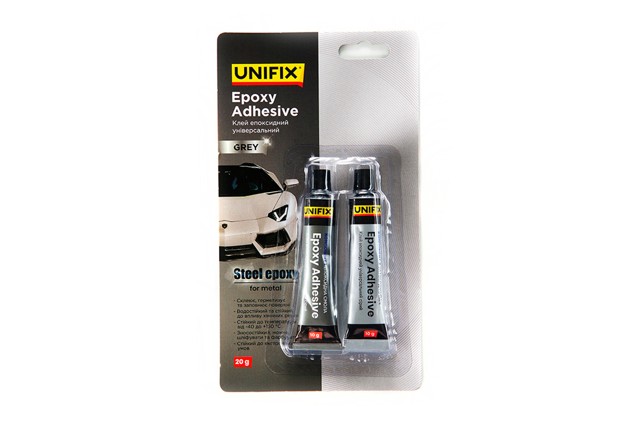 Клей епоксидний для металу Unifix - 20г тюбик сірий. Клей двокомпонентний епоксидний є універсальним засобом для надійного склеювання різних матеріалів із дерева, металу, кераміки, порцеляни. Застосовується для видалення дрібних дефектів та тріщин у виробах різного складу.