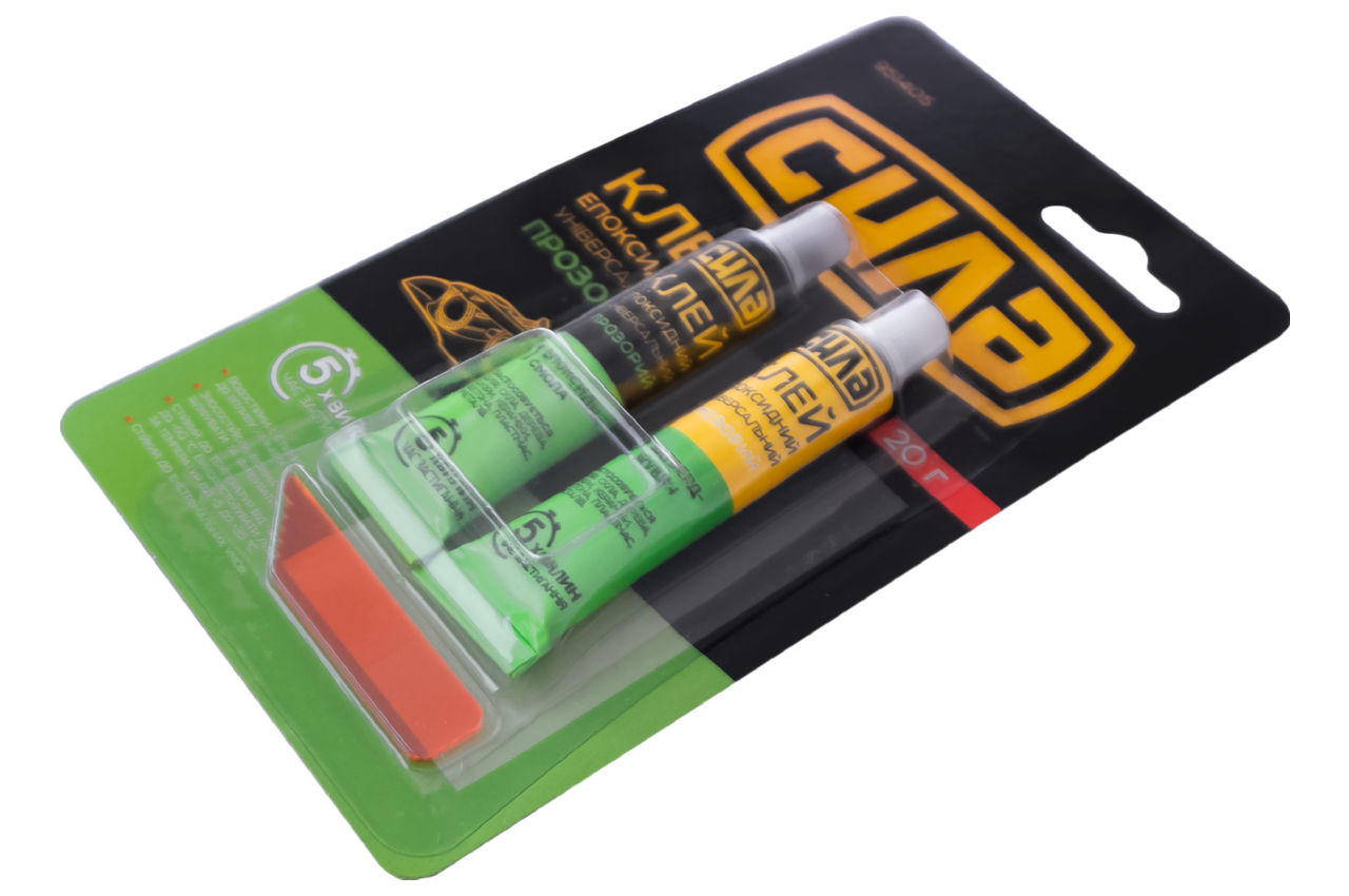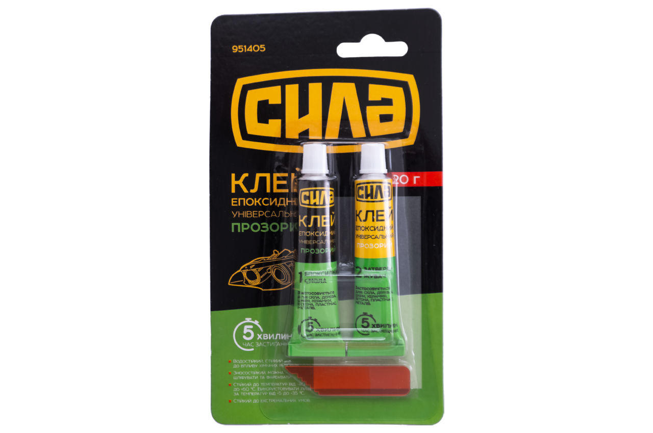 Клей епоксидний Сила - 20г прозорий. Клей двокомпонентний епоксидний є універсальним засобом для надійного склеювання різних матеріалів із дерева, металу, кераміки, порцеляни. Застосовується для видалення дрібних дефектів та тріщин у виробах різного складу.