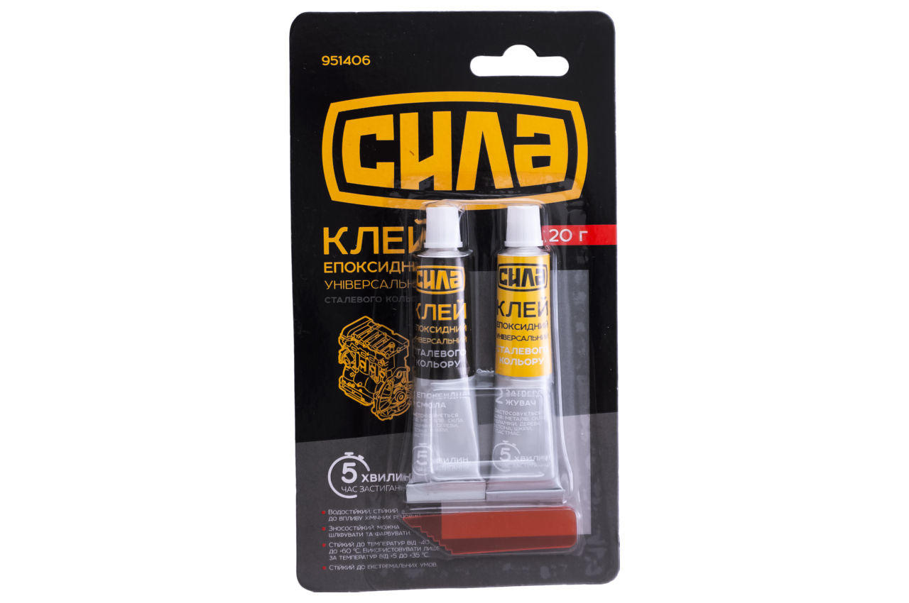 Клей епоксидний Сила - 20г сірий. Клей двокомпонентний епоксидний є універсальним засобом для надійного склеювання різних матеріалів із дерева, металу, кераміки, порцеляни. Застосовується для видалення дрібних дефектів та тріщин у виробах різного складу.
