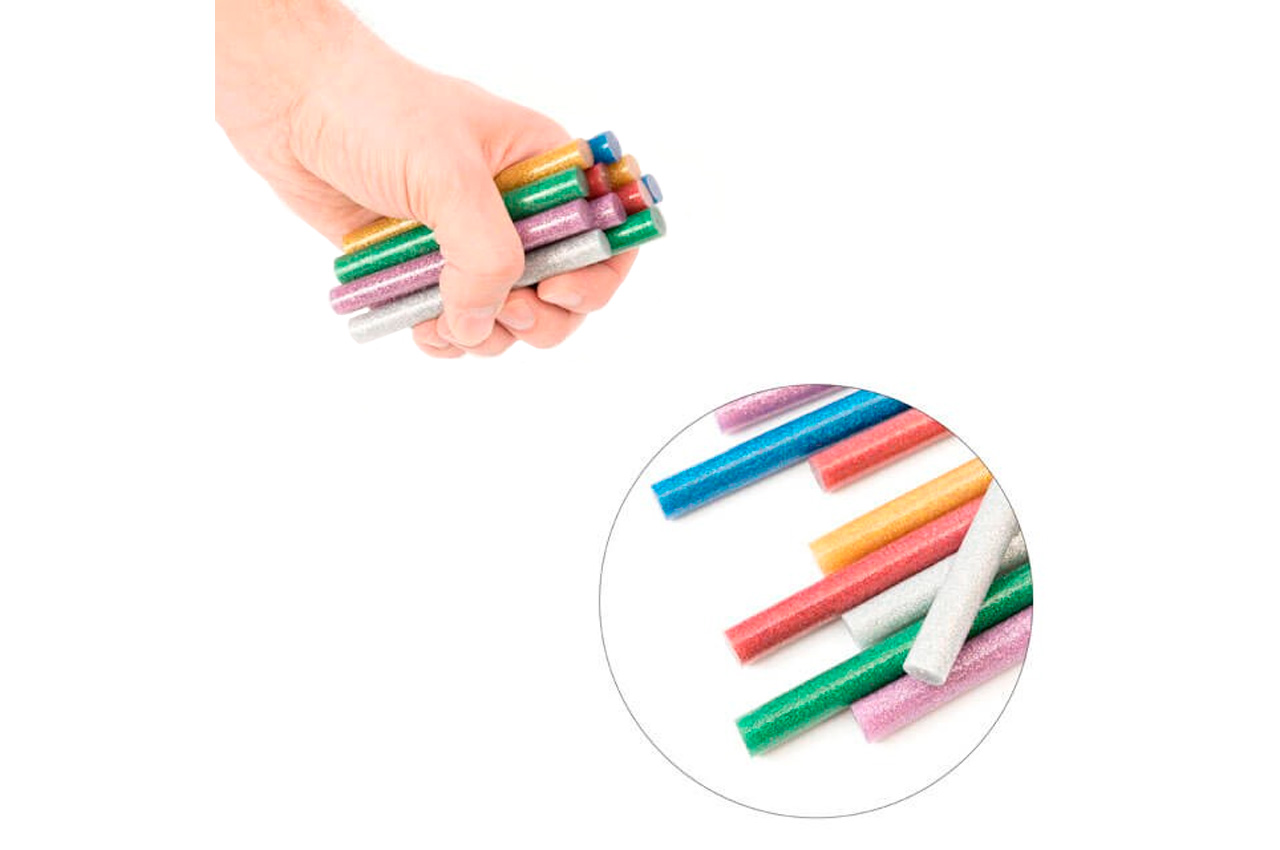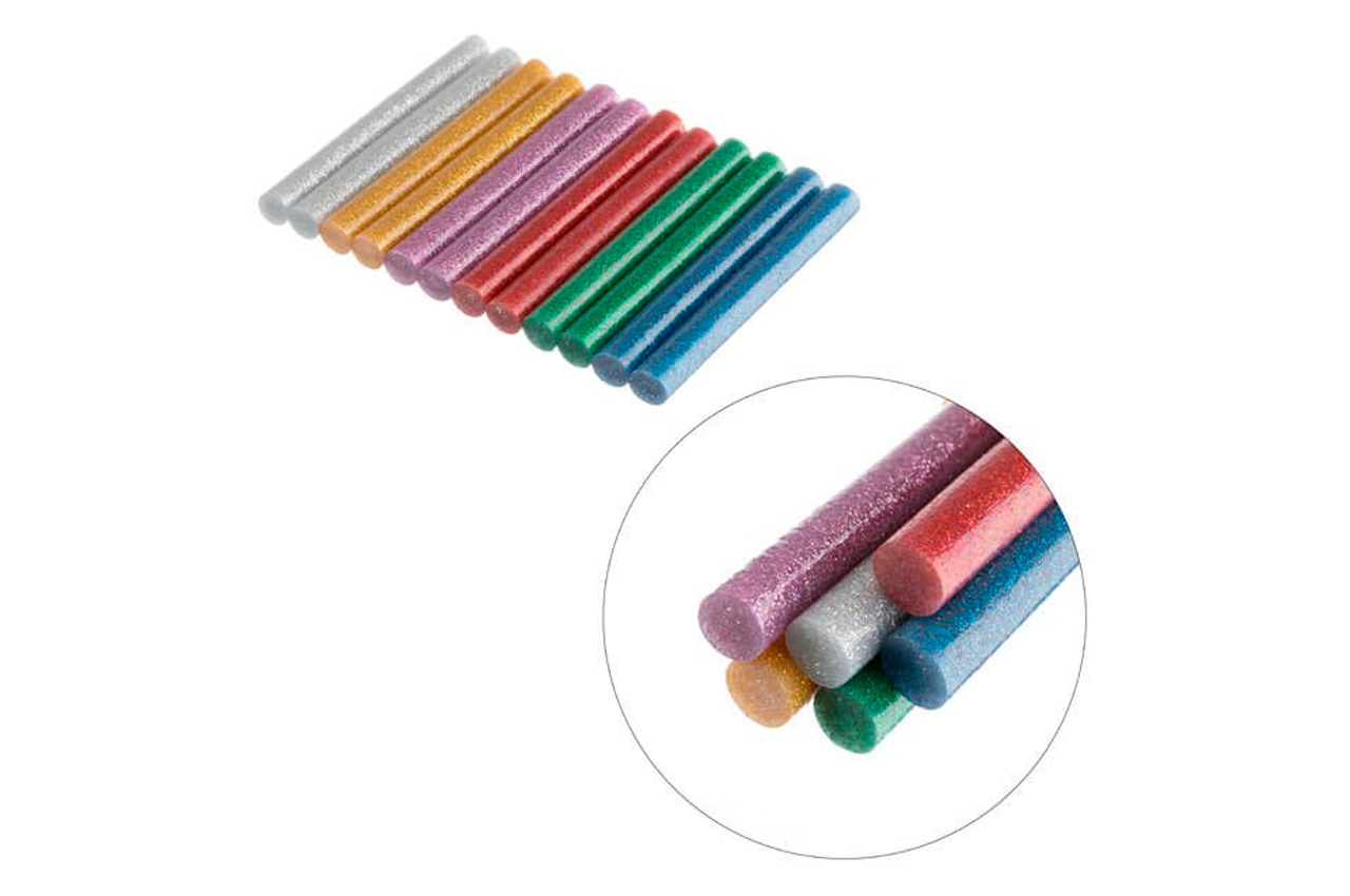 Призначені для творчих виробів, декоративних робіт і іншого рукоділля. Кольорові клейові стрижні з блискітками, виготовлені з пластичного етиленвінілацетату, безпечного для здоров'я. В комплекті 6 кольорів: срібло, золото, червоний, бузковий, зелений, синій. Температура розм'якшення: 85 ° С; Температура текучості: 160-170 ° С; Час застигання: 30-40 сек; Діаметр стрижня: 11.2 мм; Довжина стержня: 100 мм; Кількість в упаковці: 12 шт; Колір: срібло, золото, червоний, бузковий, зелений, синій