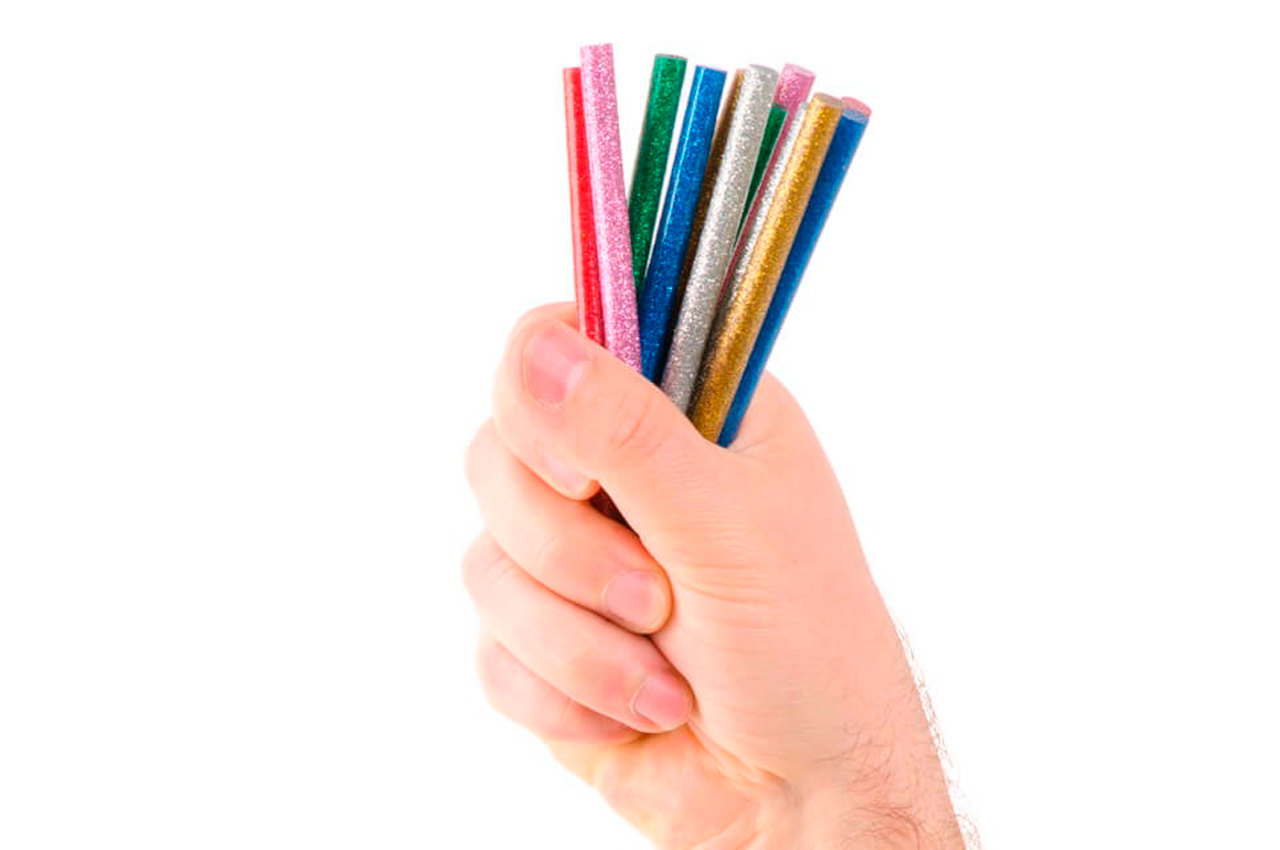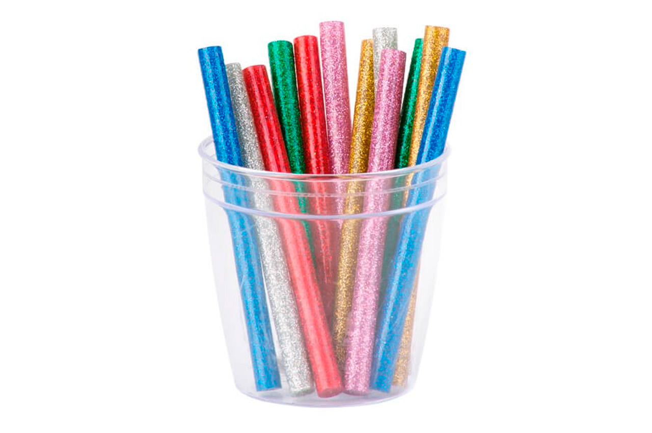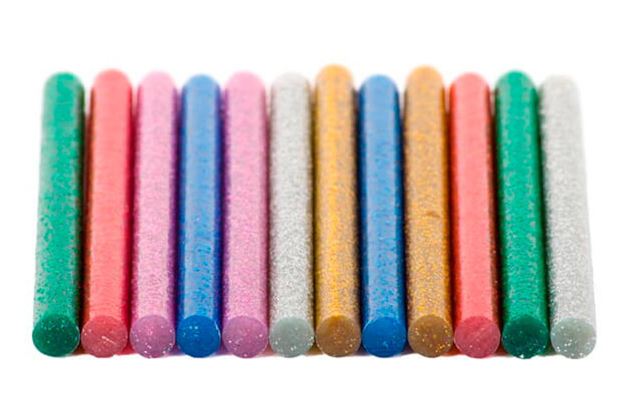 Кольорові клейові стрижні з блискітками, виготовлені з пластичного етиленвінілацетату, який безпечний для здоров'я. В комплекті 6 кольорів: срібло, золото, червоний, бузковий, зелений, синій. Температура розм'якшення: 85 ° С; Температура текучості: 160-170 ° С; Час застигання: 30-40 сек; Кількість в упаковці: 12 шт; Довжина стержня: 100 мм; Діаметр стрижня: 7.4 мм; Колір: срібло, золото, червоний, бузковий, зелений, синій