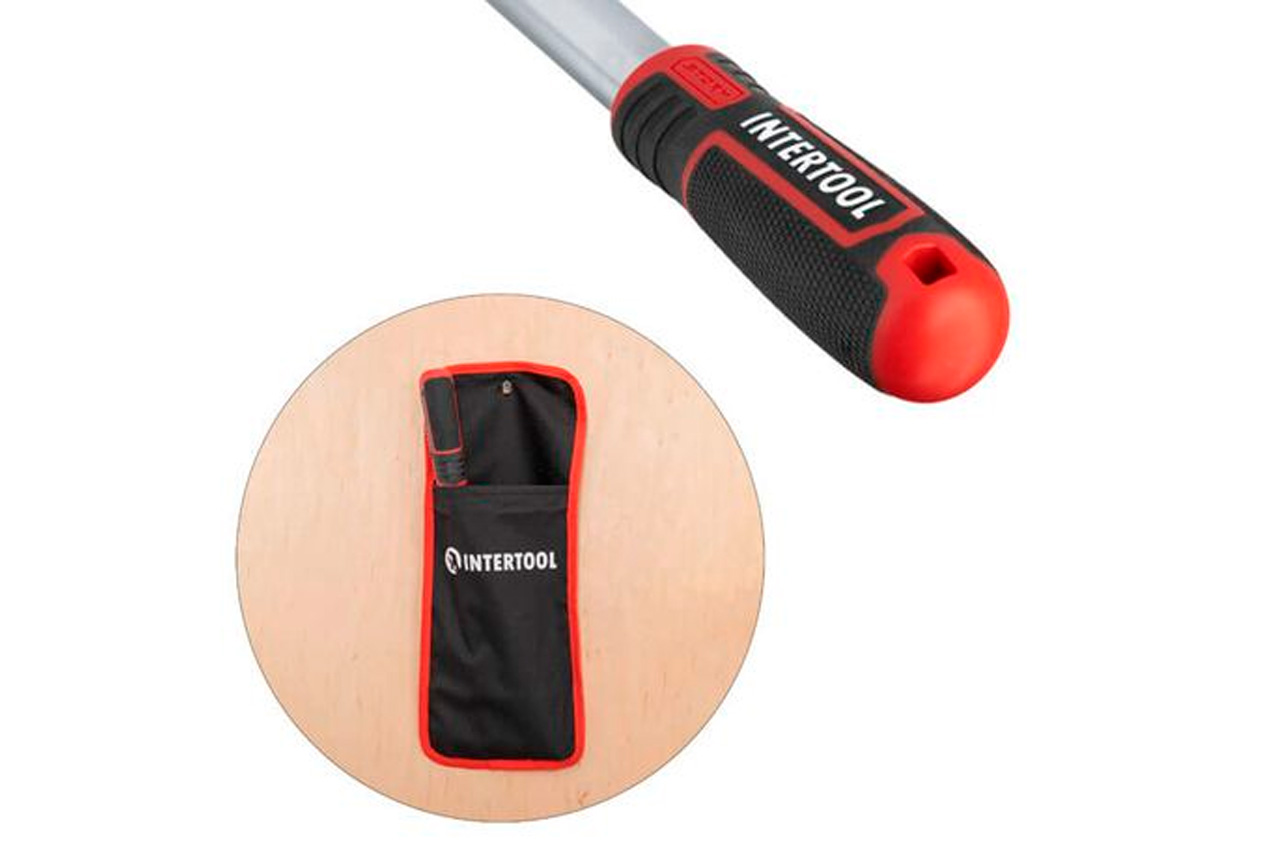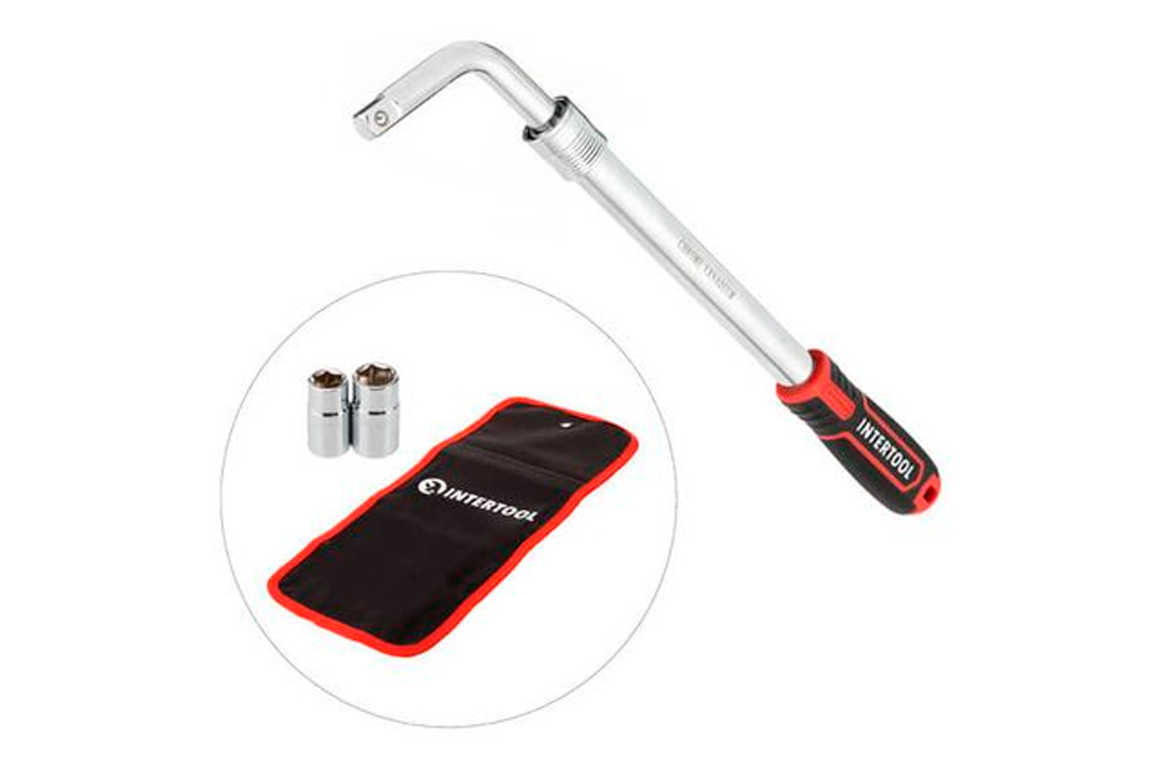 Ключ балонний телескопічний INTERTOOL HT-1601 має L- образну форму з посадковим квадратом під головки 1/2". Застосовується для монтажу та демонтажу гайок та болтів на колесах автомобілів. Це корисний помічник у гаражі у власників транспортних засобів, а також незамінний інструмент на СТО та в шиномонтажі. Ключ виготовлений з високоякісної Cr-V сталі, яка відома усім майстрам своєю надійністю та витривалістю. У складі цієї сталі присутні хром та ванадій, які надають виробу високу стійкість до зносу. Також сталь відрізняється довговічністю та не схильна до крихкого руйнування. Ключ з антикорозійним покриттям. У розкладеному вигляді телескопічний ключ має збільшене плече зусилля, що дозволяє отримувати більший момент, тим самим збільшує прикладену силу до кріплення, що недоступно звичайним балонним ключам. Телескопічна рукоятка може змінювати довжину (390-530 мм), тим самим регулювати зусилля. Це набагато спрощує роботу та економить сили оператору. Також за допомогою телескопічної ручки ви можете доставати кріплення у будь-якому важкодоступному місці без використання додаткових перехідників. В комплекті дві шестигранні головки 17х19 и 21х23 мм з подвійним розміром кожна. Надійно кріпляться до посадкового квадрату ключа завдяки шариковому фіксатору. Форма ручки забезпечує максимальну ефективність від прикладеного зусилля. Двохкомпонентна рукоятка гарантує відмінне зчеплення навіть з вологими чи забрудненими у мастилі руками, завдяки гумовим вставкам. В комплекті нейлоновий чохол для зручного зберігання ключа і головок, наявність люверсу дозволяє підвісити чохол на стіну.