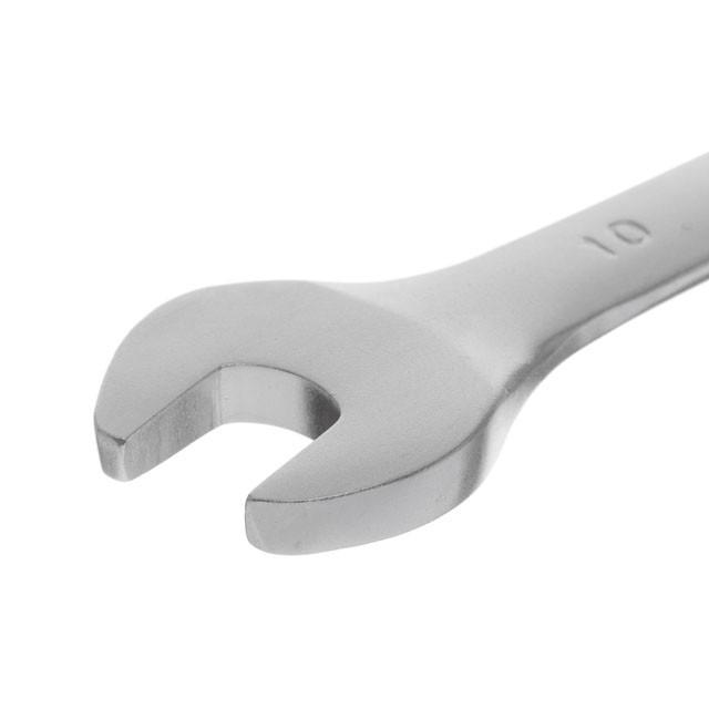 Комбінований ріжково-накидний ключ розміром 10 мм – це невід'ємний інструмент для виконання різних завдань на відкручування, закручування кріплень. Рожкова частина ключа дозволяє отримати зручний доступ до кріплення. Накидна частина з дванадцятьма гранями збільшує площу прилягання поверхонь та знижує ризик зриву граней гайок та болтів. Ключ виготовлений із міцної Cr-V сталі.