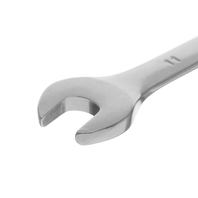 Комбінований ріжково-накидний ключ розміром 11 мм – це невід'ємний інструмент для виконання різних завдань на відкручування, закручування кріплень. Рожкова частина ключа дозволяє отримати зручний доступ до кріплення. Накидна частина з дванадцятьма гранями збільшує площу прилягання поверхонь та знижує ризик зриву граней гайок та болтів. Ключ виготовлений із міцної Cr-V сталі.