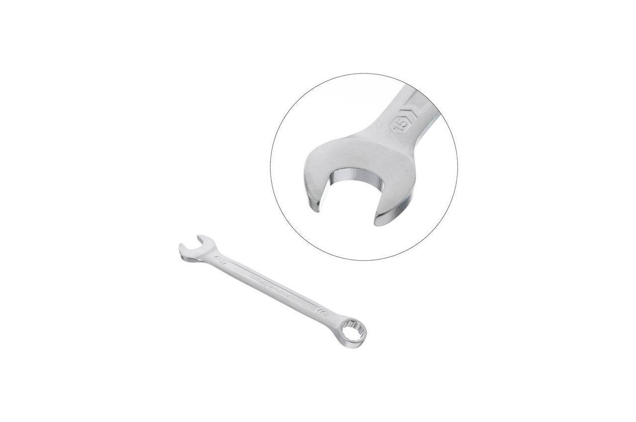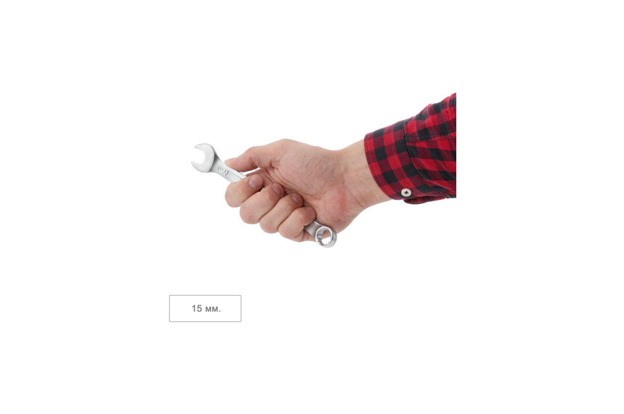 Комбінований рожково-накидний ключ, розміром 15 мм - це невід'ємний інструмент для виконання різних завдань на відкручування, закручування кріплень. Широко використовується в усіх сферах від побутового застосування до професійного, завдяки високим експлуатаційним характеристикам. Ключ виготовлений з міцної Cr-V стали, методом холодного штампування, що гарантує виняткову зносостійкість і довговічність. Відмінно витримує постійні навантаження і має високу антикорозійну стійкість завдяки тришаровому покриттю. Поверхня ключа також матоване сатин-хромом для надійного захоплення в роботу навіть забрудненими в маслі руками. Ви можете бути впевнені в якості ключа, адже його підтверджує довічна гарантія! Особливості: Надміцна, зносостійка Cr-V сталь, не схильна до деформацій. Ключ відповідає європейському стандарту якості DIN3113. Зручний в роботі - форма і вигин рукоятки ключа з оптимальним важелем для прикладення зусилля. Розмір ключа: 15 мм; Покриття: сатин-хром