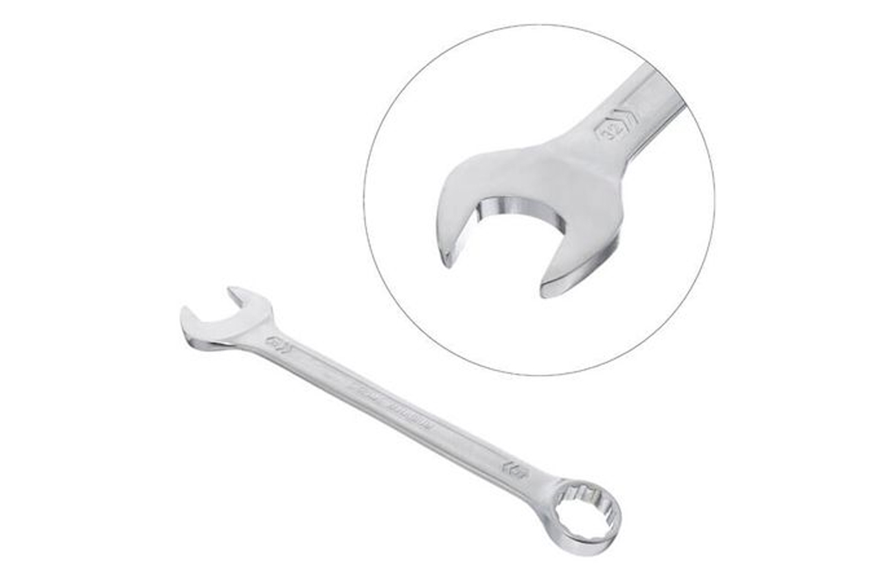 Комбінований рожково-накидний ключ, розміром 32 мм - це невід'ємний інструмент для виконання різних завдань на відкручування, закручування кріплень. Широко використовується в усіх сферах від побутового застосування до професійного, завдяки високим експлуатаційним характеристикам. Ключ виготовлений з міцної Cr-V стали, методом холодного штампування, що гарантує виняткову зносостійкість і довговічність. Відмінно витримує постійні навантаження і має високу антикорозійну стійкість завдяки тришаровому покриттю. Поверхня ключа також матоване сатин-хромом для надійного захоплення в роботу навіть забрудненими в маслі руками. Ви можете бути впевнені в якості ключа, адже його підтверджує довічна гарантія! Особливості: Надміцна, зносостійка Cr-V сталь, не схильна до деформацій. Ключ відповідає європейському стандарту якості DIN3113. Зручний в роботі - форма і вигин рукоятки ключа з оптимальним важелем для прикладення зусилля. Розмір ключа: 32 мм; Покриття: сатин-хром