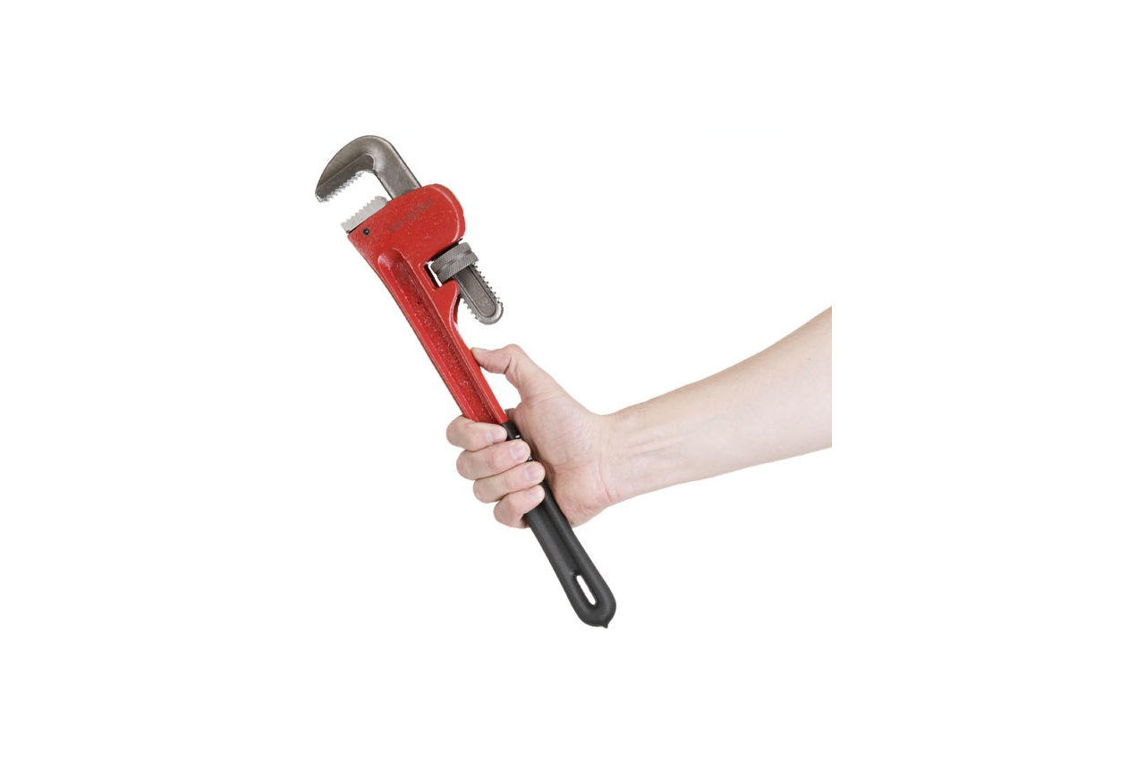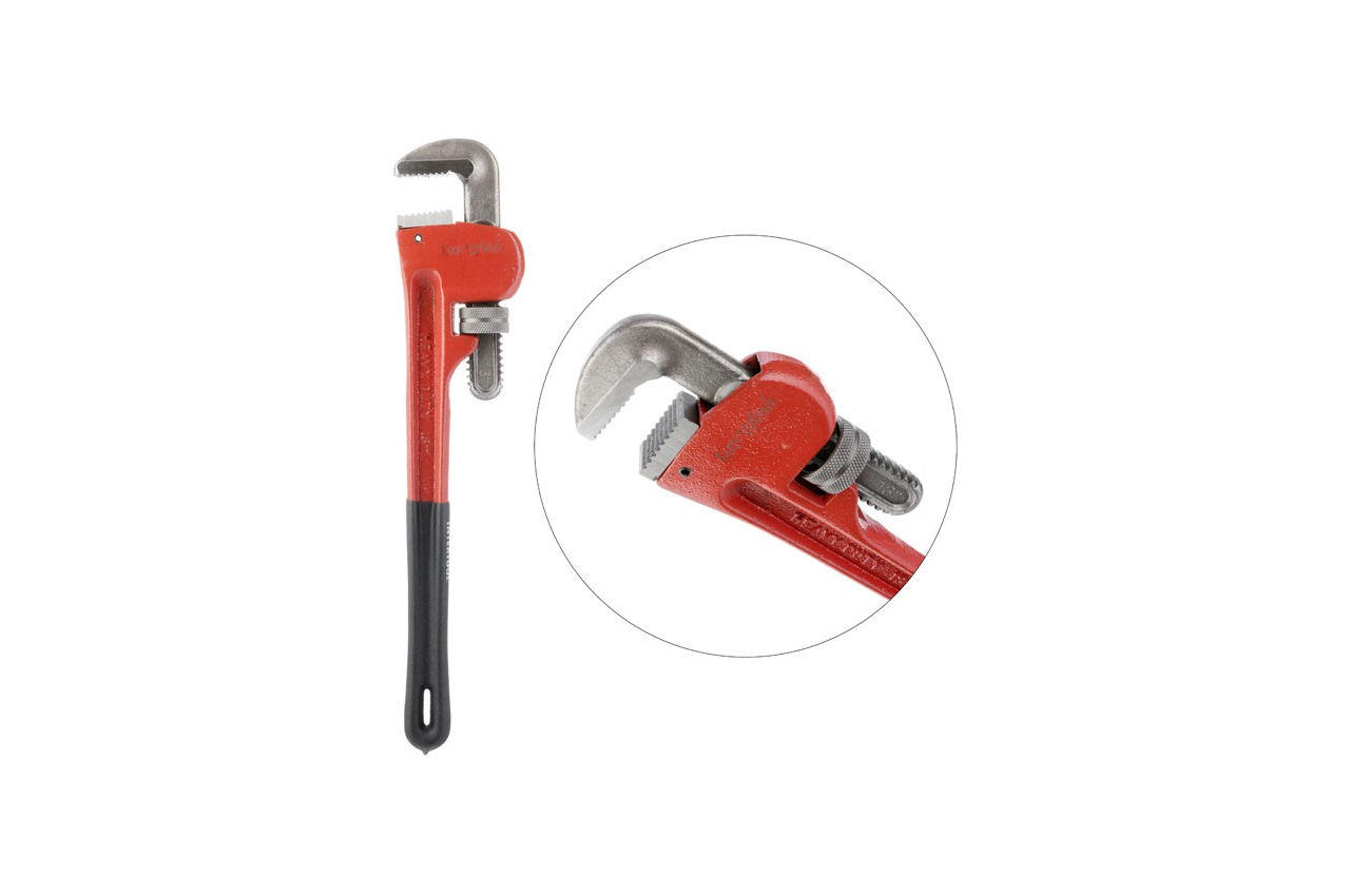 Ключ трубний тип Stillson застосовується для ремонтно-сантехнічних робіт, в тих місцях, де труби скріплені між собою за допомогою різьбових з'єднань. Губки розташовані під кутом 90 ° по відношенню до ручок. Діаметр захоплення регулюється за рахунок рухомого верхнього важеля. Виготовлений з високоякісної інструментальної сталі. Ергономічна прогумована рукоятка. Максимальна ширина захвату: 75 мм