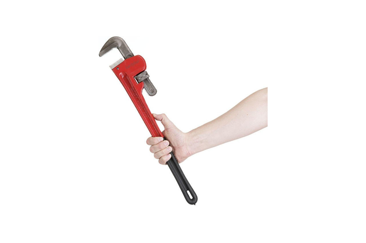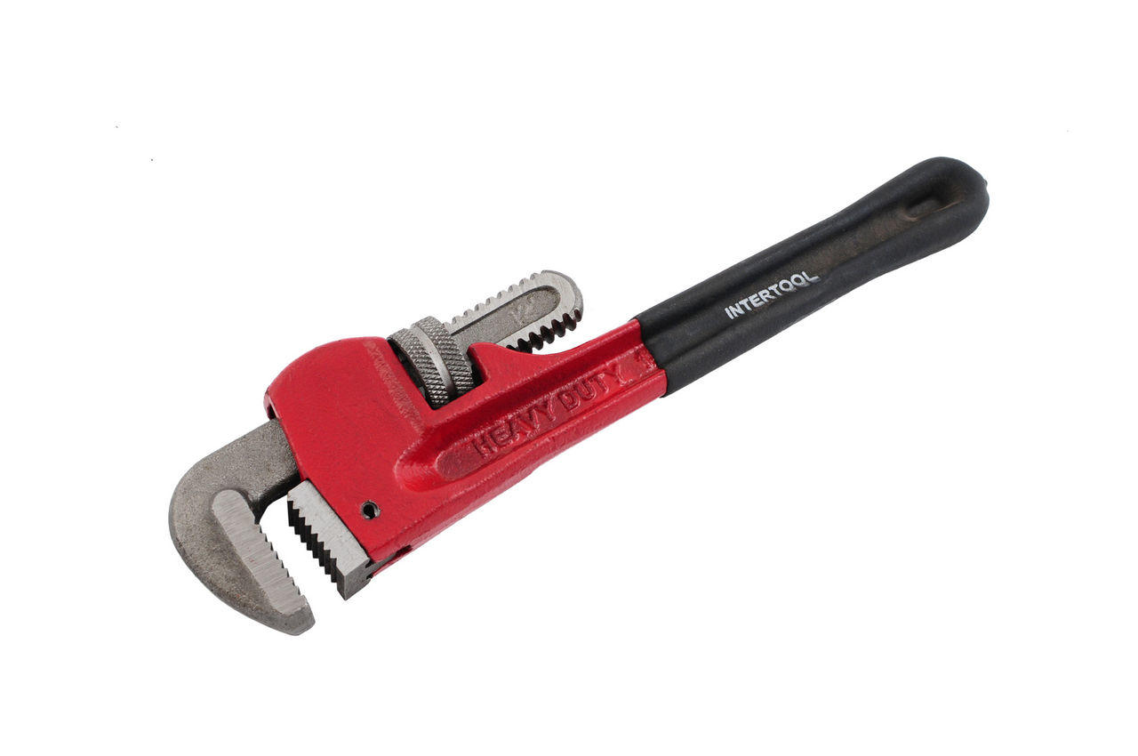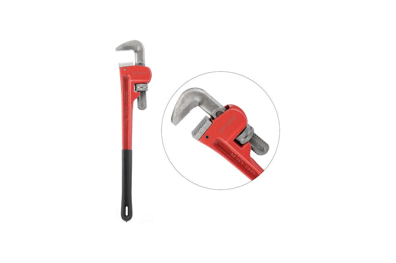 Ключ трубний тип Stillson застосовується для ремонтно-сантехнічних робіт, в тих місцях, де труби скріплені між собою за допомогою різьбових з'єднань. Губки розташовані під кутом 90 ° по відношенню до ручок. Діаметр захоплення регулюється за рахунок рухомого верхнього важеля. Виготовлений з високоякісної інструментальної сталі. Ергономічна прогумована рукоятка. Максимальна ширина захвату: 90 мм