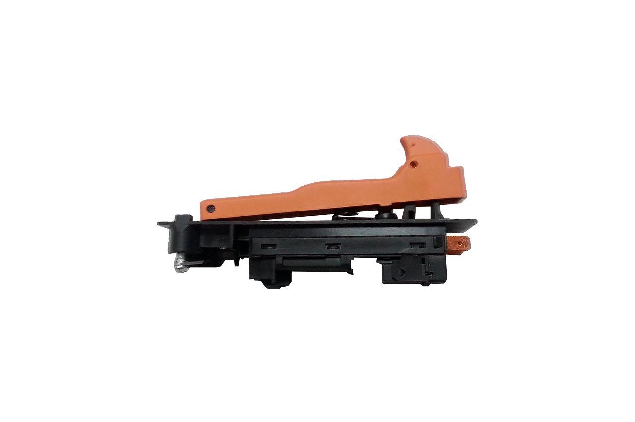 Кнопка болгарки Makita 9069. З захистом від випадкового пуску (включиться тільки посленажатія на додатковий курок попереду педалі). Має кріплення мережевих дротів гвинтами, проводів з двигуна - клемами. Має посадку під кріплення фіксатора кабелю.